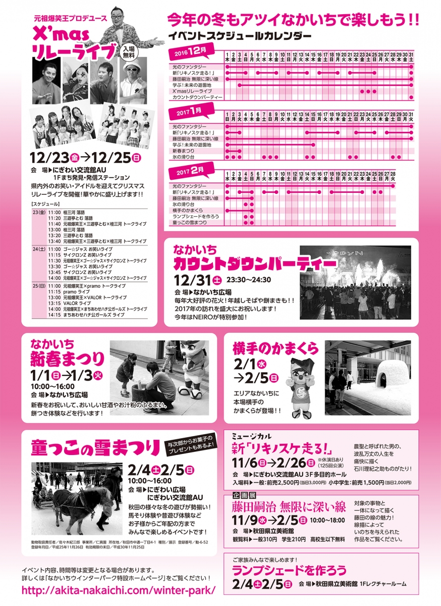 《なかいちウインターパーク》氷の滑り台 期間:2017年01月07日 ~ 2017年01月09日 開催日:平成29年1月1日(日)~3日(火) 7日(土)~9日(月) 14日(土)、15日(日) 21日(土)、22日(日) 28日(土)、29日(日) 平成29年2月4日(土)、5日(日) ※天候による滑り台の氷の状態次第で中止する場合がございますので、 あらかじめご了承ください。 時 間:10:00~16:00 会 場:にぎわい広場 料 金:無料