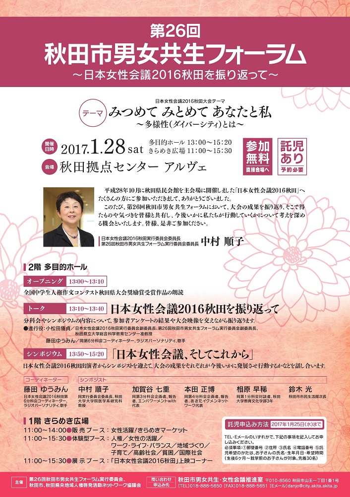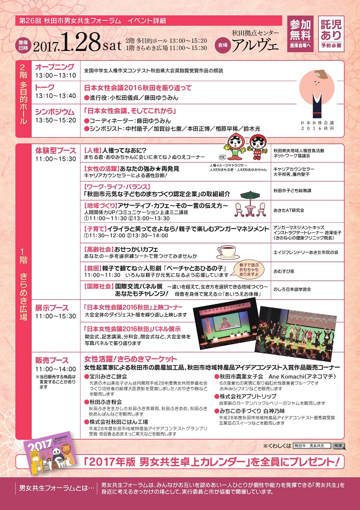 秋田市男女共生フォーラム 期間:2017年01月28日 開催日:平成29年1月28日(土) 時 間:11:00~ 会 場:アルヴェ 1Fきらめき広場、2F多目的ホール 入場料:無料 問合せ:秋田市男女共生・女性会議推進室 ☎︎018-888-5650