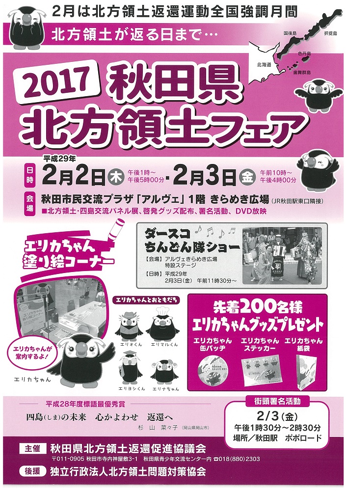 2017秋田県北方領土フェア 期間:2017年02月02日 ~ 2017年02月03日 開催日:平成29年2月2日(木)、3日(金) 時 間:2日 13:00~17:00 3日 10:00~16:00 会 場:アルヴェ 1階 きらめき広場 入場料:無料 問合せ:秋田県北方領土返還促進協議会 ☎︎018-880-2303