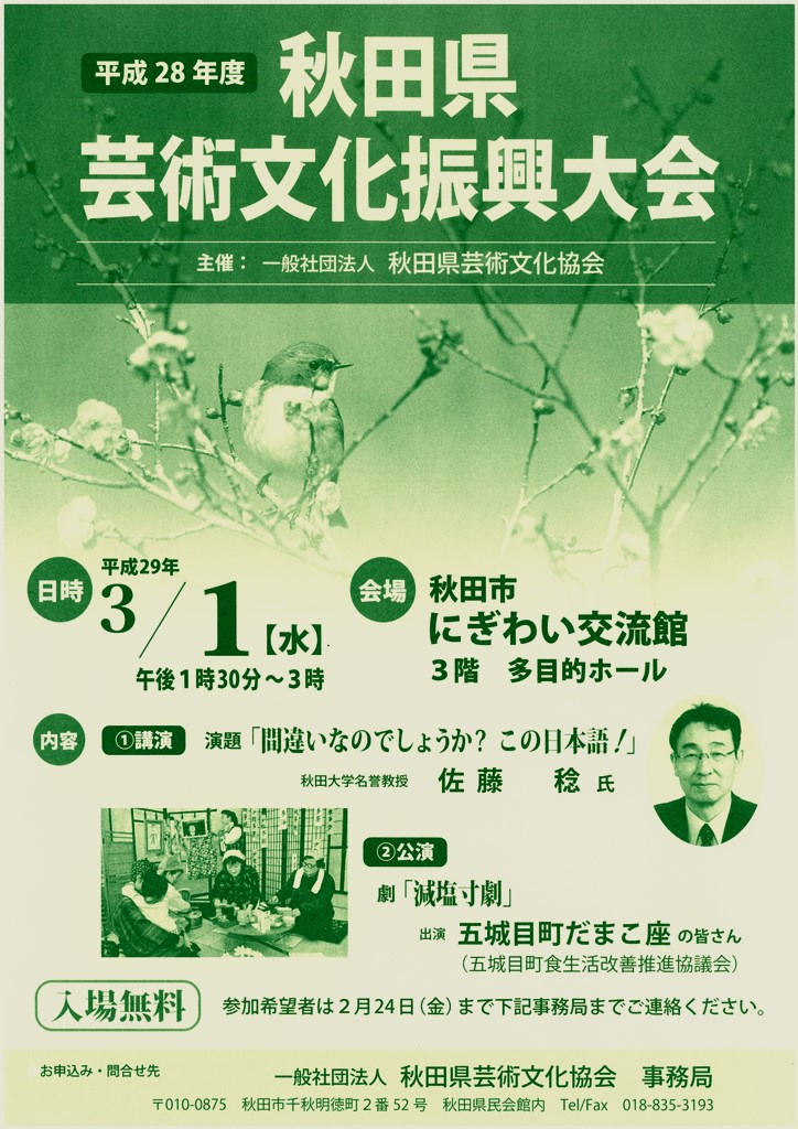 秋田県芸術文化振興大会 期間:2017年03月01日 開催日:3月1日(水) 時 間:13:30~15:00 会 場:秋田市にぎわい交流館 3F 多目的ホール 入 場:無料 参加希望者は2月24日(金)まで下記事務局までご連絡ください。 申込・問合せ:一般社団法人 秋田県芸術文化協会 事務局 〒010-0875 秋田市千秋明徳町2番52号 秋田県民会館内 Tel/Fax 018-835-3193