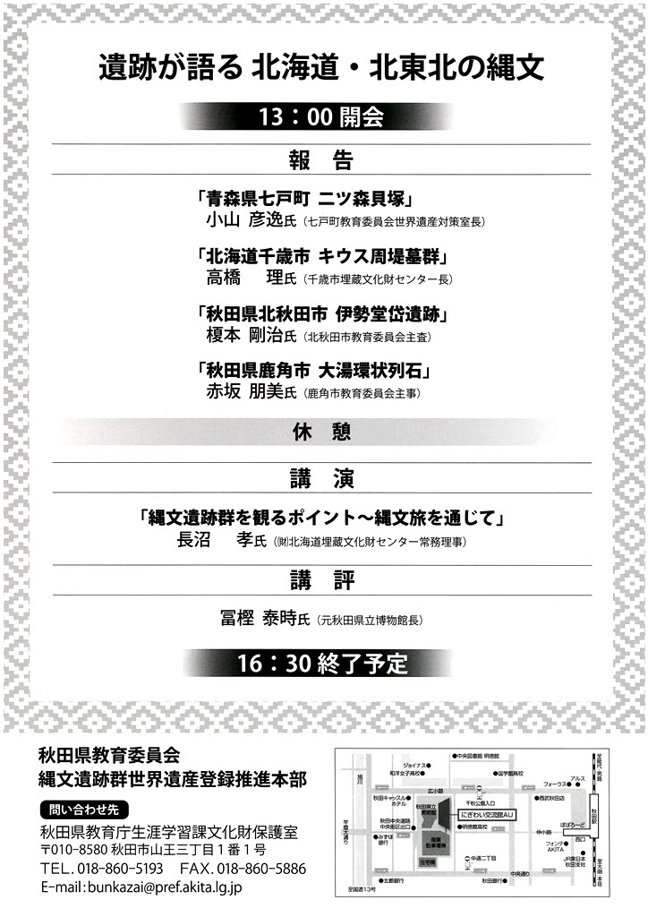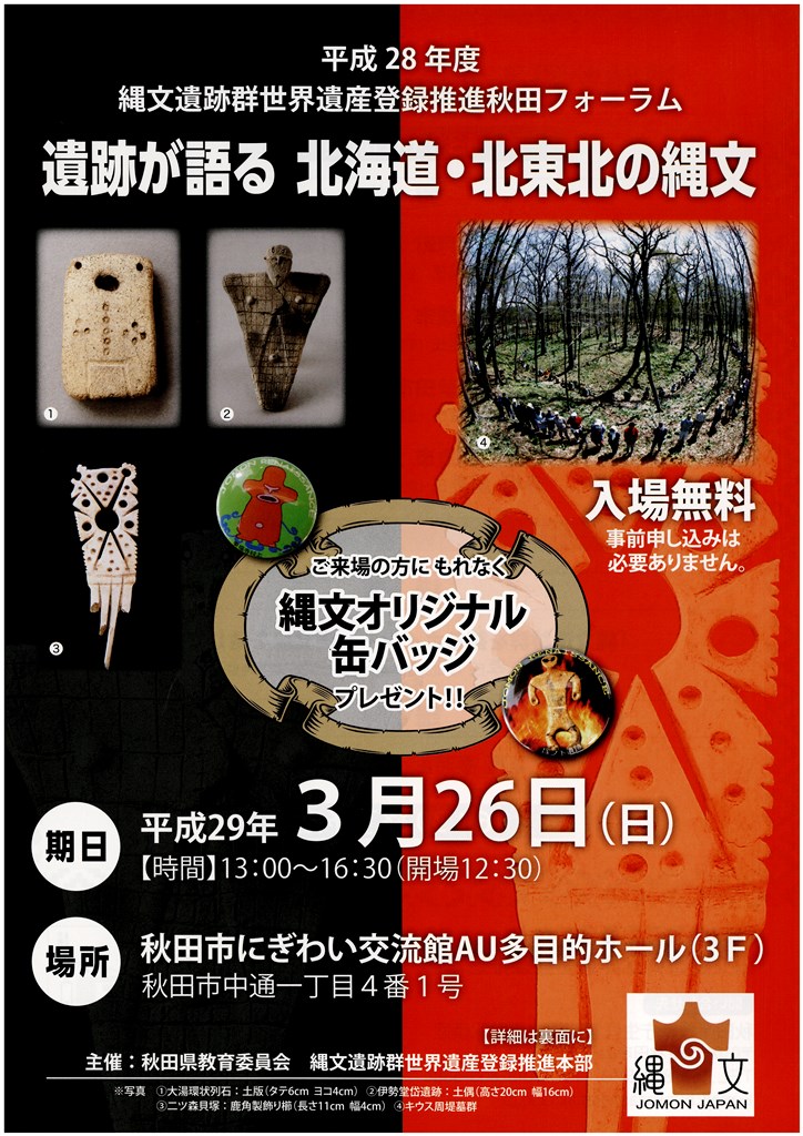 平成28年度 縄文遺跡群世界遺産登録推進秋田フォーラム 期間:2017年03月26日 開催日:3月26日(日) 時 間:13:00~16:30 (開場 12:30) 会 場:にぎわい交流館 3F 多目的ホール 入 場:無料 主 催:秋田県教育委員会 縄文遺跡群世界遺産登録推進本部 問合せ:秋田県教育庁生涯学習課文化財保護室 〒010-8580 秋田市山王三丁目1番1号 TEL 018-860-5193/FAX 018-8660-5886 E-mail bunkazai@pref.akita.lg.jp