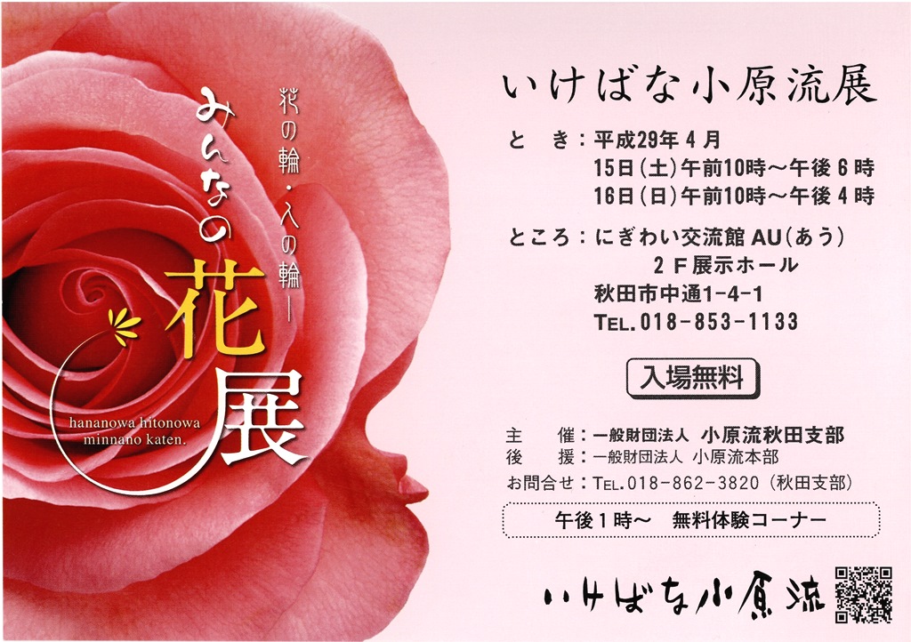 いけばな小原流 花の輪・人の輪-みんなの花展 期間:2017年04月15日 ~ 2017年04月16日 開催日:4月15日(土) 午前10時~午後6時 4月16日(日) 午前10時~午後4時 会 場:にぎわい交流館 2F 展示ホール 入 場:無料 主 催:一般財団法人 小原流秋田支部 問合せ:☎ 018-862-3820 (秋田支部)