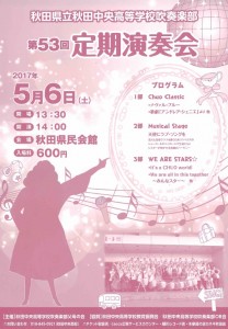 秋田中央高校吹奏楽部 第53回定期演奏会 期間:2017年05月06日 開催日:平成29年5月6日(土) 時 間:14:00~16:30 会 場:秋田県民会館 大ホール 入場料:全席自由600円 問合せ:秋田県立秋田中央高等学校 ☎018-845-0921(原田)