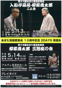 第19回あきた落語愛嬌会 柳家喬太郎 三題噺の会 期間:2017年05月14日 開催日:平成29年5月14日(日) 時 間:18:30~ (開場18:00) 会 場:アルヴェ 2階多目的ホール 料 金:全席自由 前売3,000円 当日3,500円 問合せ:あきた落語愛嬌会 ☎090-5180-7989