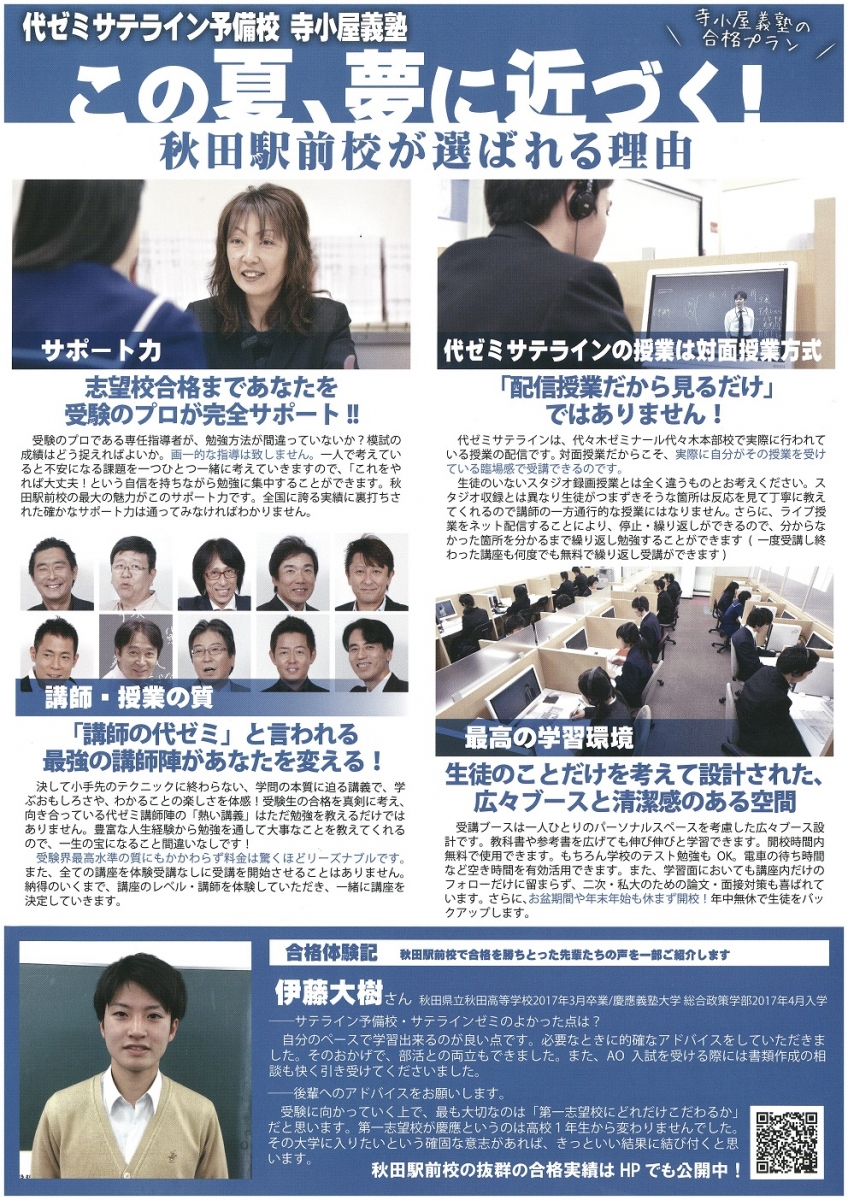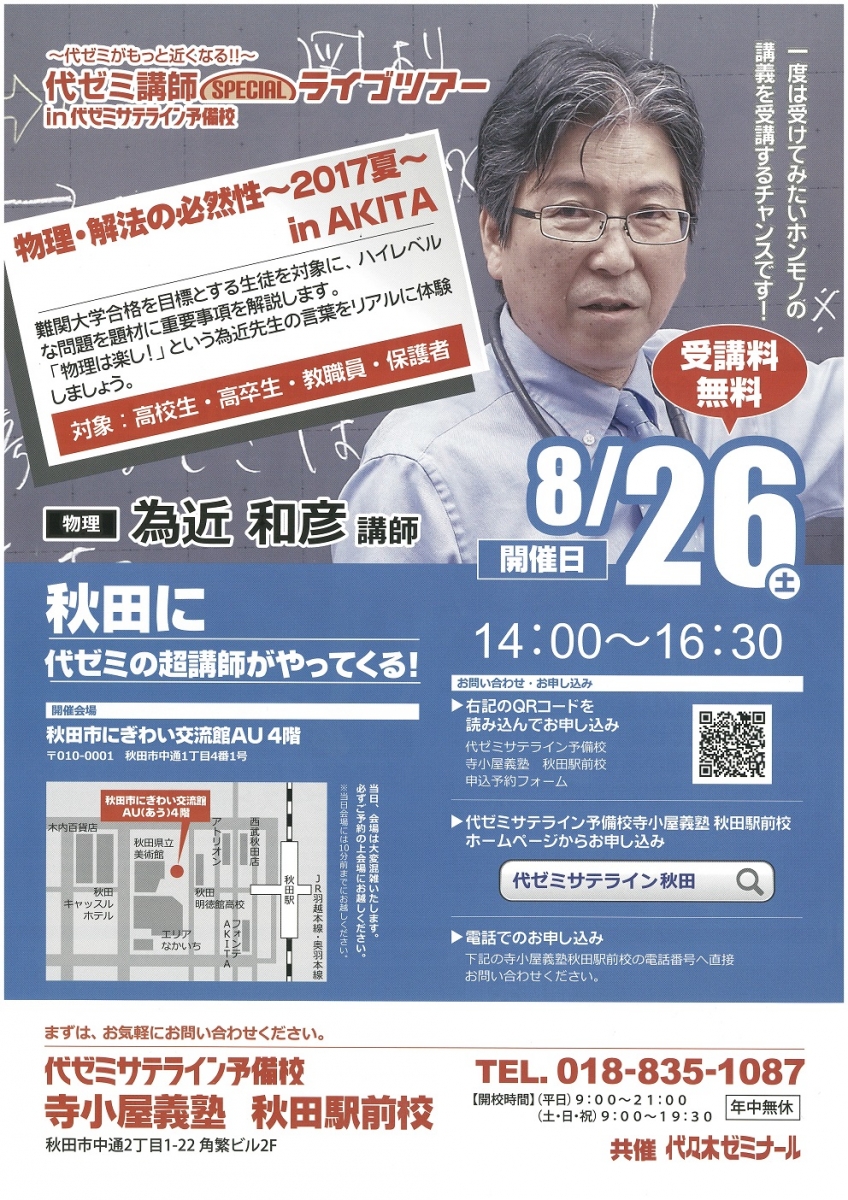 代ゼミ講師SPECIALライブツアー in 代ゼミサテライン予備校 期間:2017年08月26日 開催日:8月26日(土) 時 間:14:00~16:30 会 場:秋田市にぎわい交流館 4F 研修室1・2 受講料:無料 問合せ:代ゼミサテライン予備校 寺小屋義塾 秋田駅前校 秋田市中通2丁目1-22角繁ビル2F TEL 018-835-1087 【開校時間】(平日)9:00~21:00 (土・日・祝)9:00~19:30 HP 代ゼミサテライン秋田
