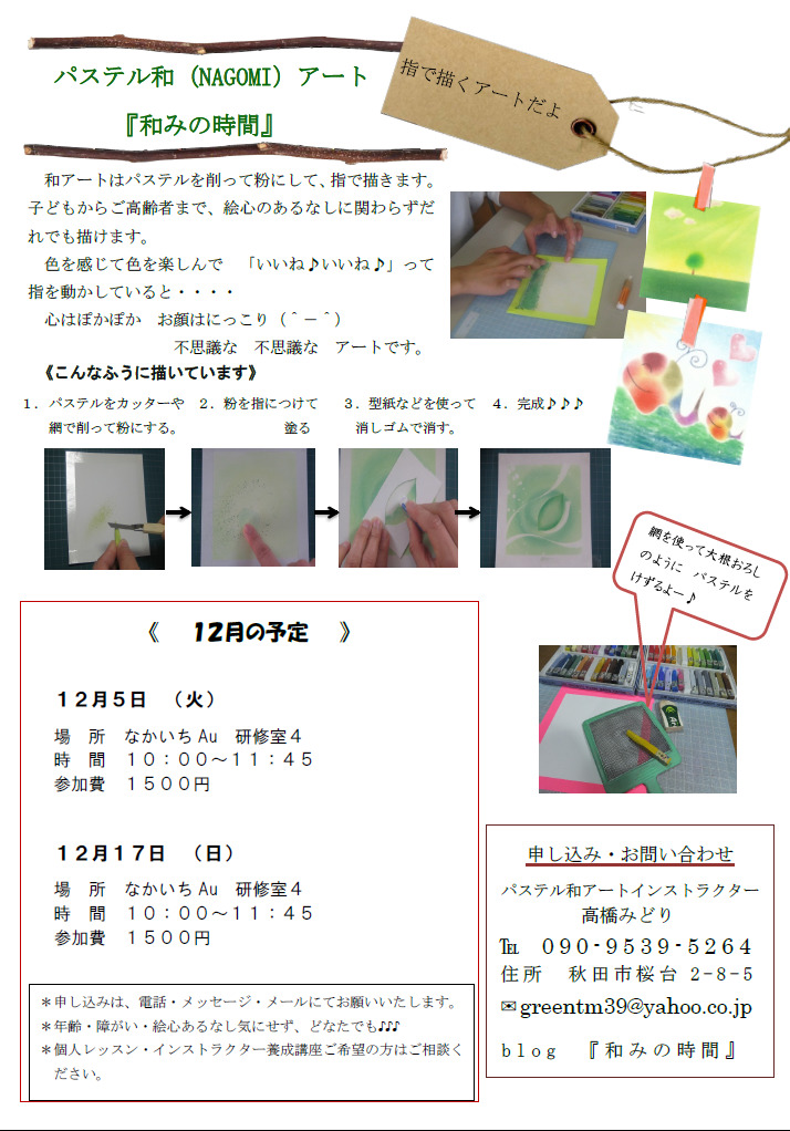 パステル和(NAGOMI)アート「和みの時間」指で描くアートだよ 期間:2017年12月05日 ・開催日:平成29年12月17日(日) ・時 間:10:00~11:45 ・会 場:4F研修室4 ・参加費:1500円 ・申し込み&お問い合わせ パステル和アートインストラクター 高橋みどり ℡:090-9539-5264 mail:greentm39@yahoo.co.jp