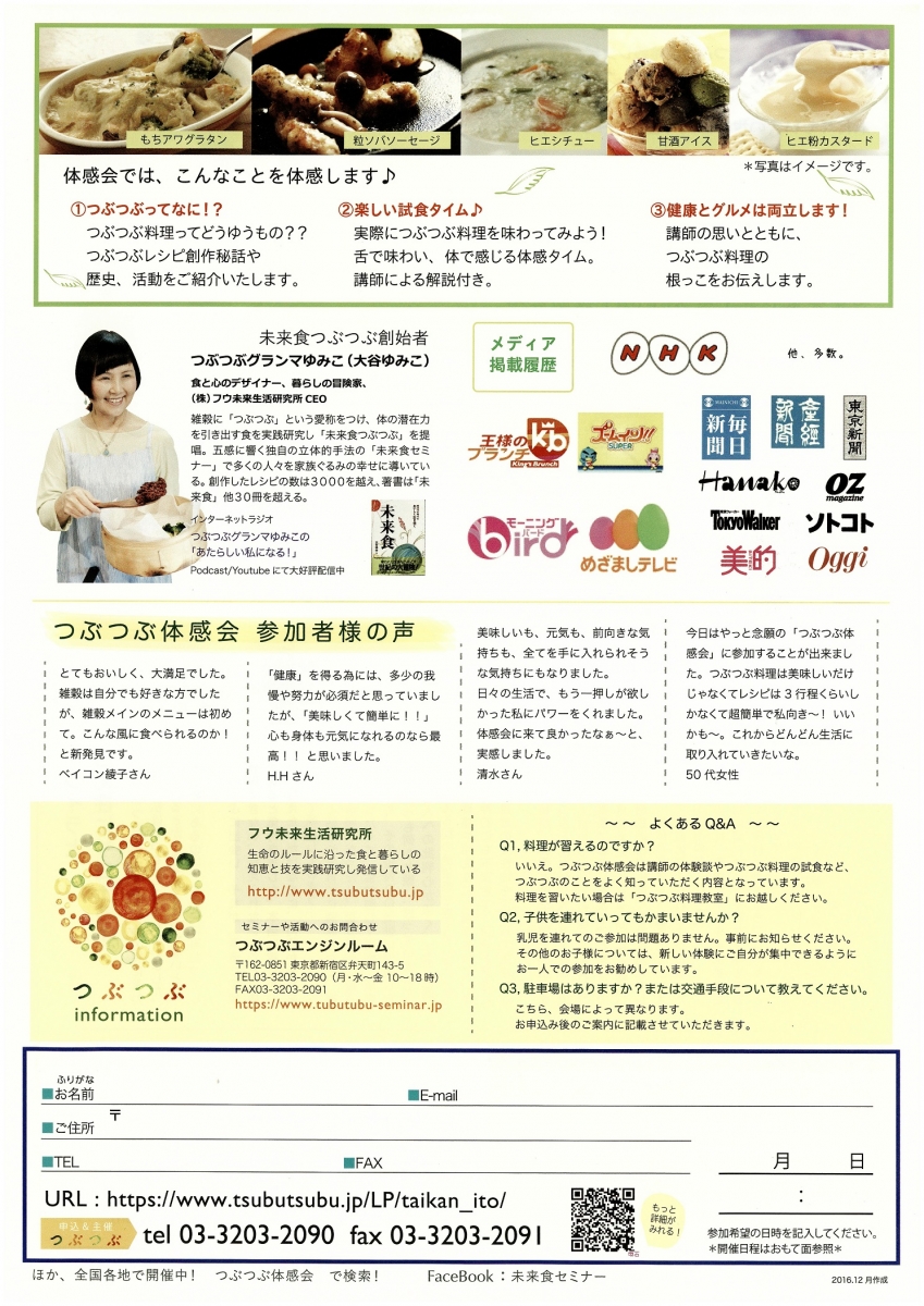 つぶつぶ料理体感会 in 秋田市 期間:2018年06月16日 開催日:6月13日(水) にぎわい交流館AU 4F 研修室6 6月16日(土) にぎわい交流館AU 2F アート工房2 時 間:①11:00~12:30/②14:00~15:30 参加費:3,000円(90分・軽食つき) 申 込:申込案内 問合せ:講師Tel 080-8203-0989(伊藤) E-mail tubu2shizukuishi@gmail.com