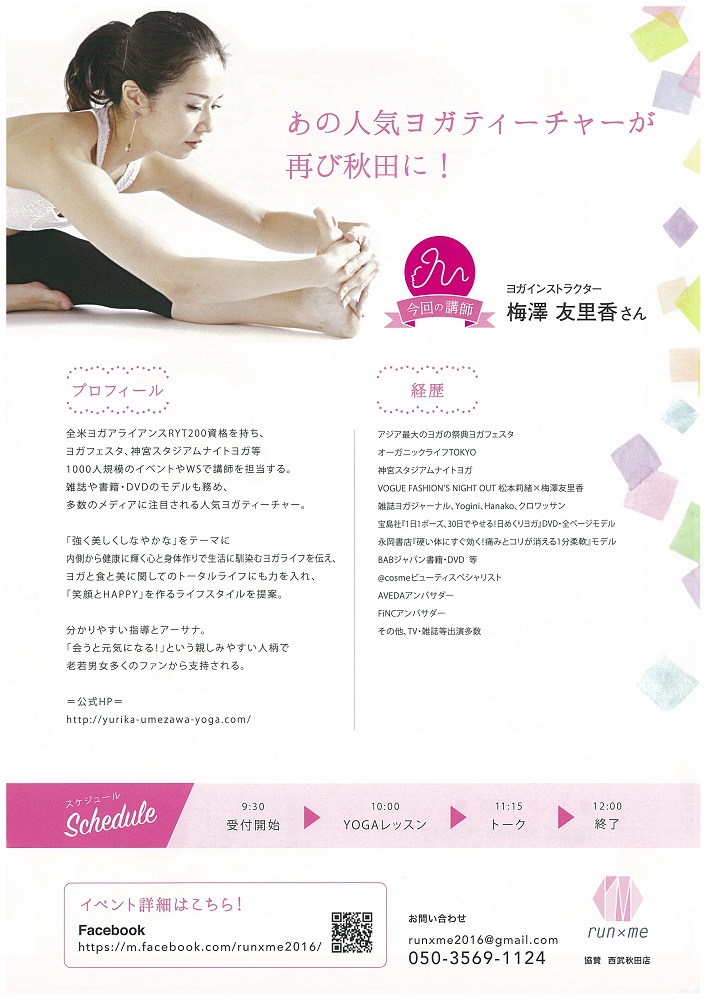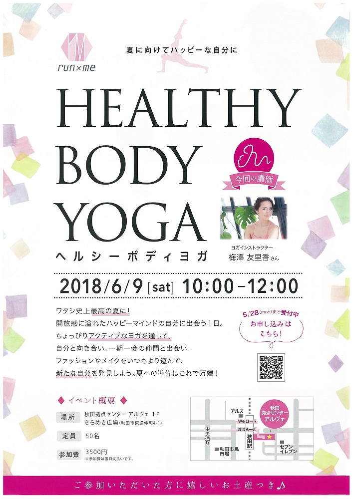 【女性限定】ヘルシーボディヨガ 期間:2018年06月09日 開催日:6月9日(土) 時 間:10時00分~12時00分 場 所:秋田拠点センターアルヴェ1階 きらめき広場 参加料:3,500円(当日支払) 定 員:50名(女性限定、先着順) 問い合わせ先:runxme2016@gmail.com TEL 050-3569-1124 ご参加いただいた方に嬉しいお土産つきです!