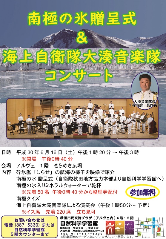 南極の氷贈呈式&海上自衛隊大湊音楽隊コンサート 期間:2018年06月16日 開催日6月16日(土) 時 間:13時20分~15時00分 場 所;アルヴェ1Fきらめき広場 対 象:どなたでも 申 込:なし(直接会場へ) ただし、南極の氷入りミネラルウォーターは先着50名整理券配付 内 容:砕氷艦「しらせ」の航海の様子を映像で紹介 南極の氷贈呈式、南極の氷入りミネラルウォーターで乾杯 南極クイズに挑戦 海上自衛隊大湊音楽隊による演奏会(13時50分~予定) 問い合わせ先:自然科学学習館 TEL 018-887-5330