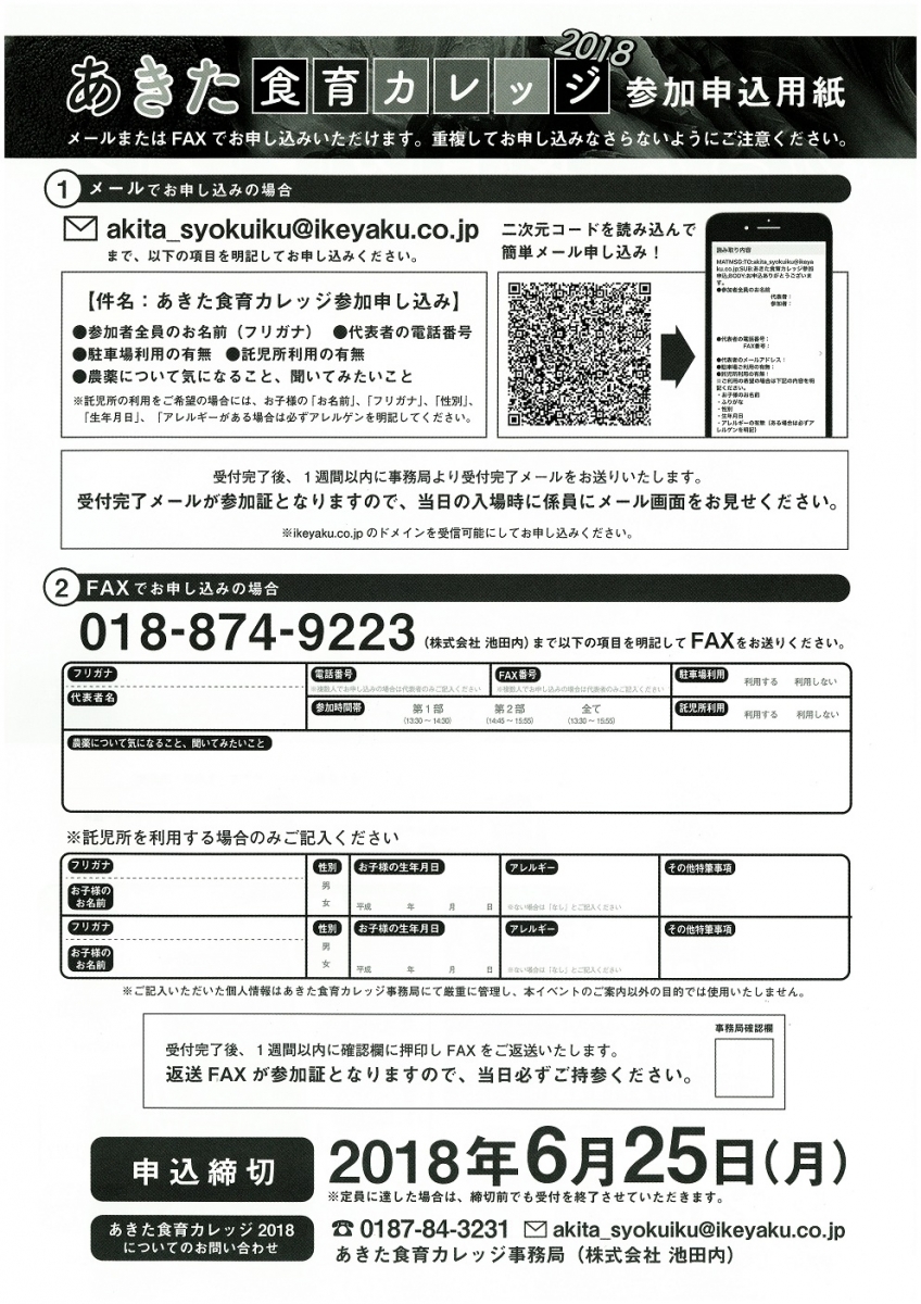 - 問合せ:TEL 0187-84-3231/E-mail akita_syokuiku@ikeyaku.co.jp