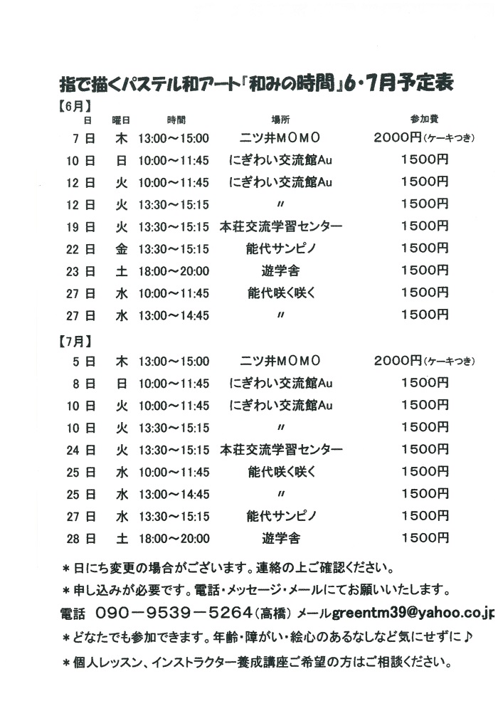 - 問合せ:パステル和(NAGOMI)アートインストラクター 高橋みどり