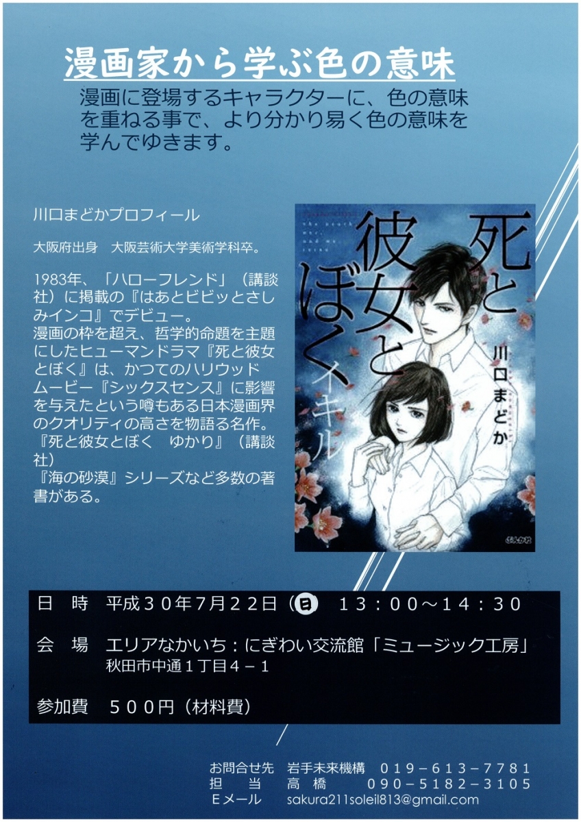 漫画家から学ぶ色の意味 期間:2018年07月22日 開催日:平成30年7月22日(日) 時 間:13:00~14:30 会 場:にぎわい交流館AU 3F ミュージック工房1 材料費:500円 問合せ:岩手未来機構 TEL 019-613-7781 担当 高橋 TEL 090-5182-3105 E-mail sakura211soleil813@gmail.com