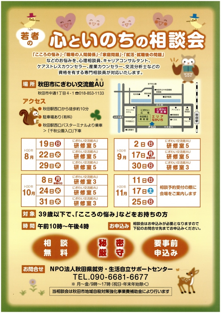 相談会はお申込みが必要となりますので下記のお問合せ先までお申込みください。 - 問合せ:NPO法人秋田県就労・生活自立サポートセンター