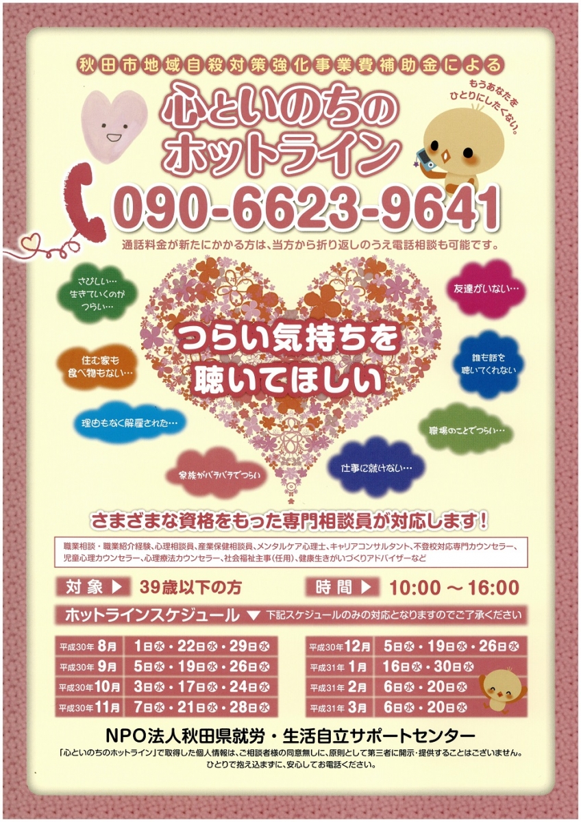 若者の心といのちの相談会 期間:2018年10月31日 開催スケジュール・10月08日(月) にぎわい交流館AU 4F 研修室3・10月24日(水) にぎわい交流館AU 4F 研修室5・10月31日(水) にぎわい交流館AU 4F 研修室3 時 間:10:00~16:00 相 談:無料 対 象:39歳以下で、「こころの悩み」などをお持ちの方 申 込:要事前申込 相談会はお申込みが必要となりますので下記のお問合せ先までお申込みください。 問合せ:NPO法人秋田県就労・生活自立サポートセンター TEL 090-6681-6677 ※月~金/9:00~17:00(祝日・年末年始除く)