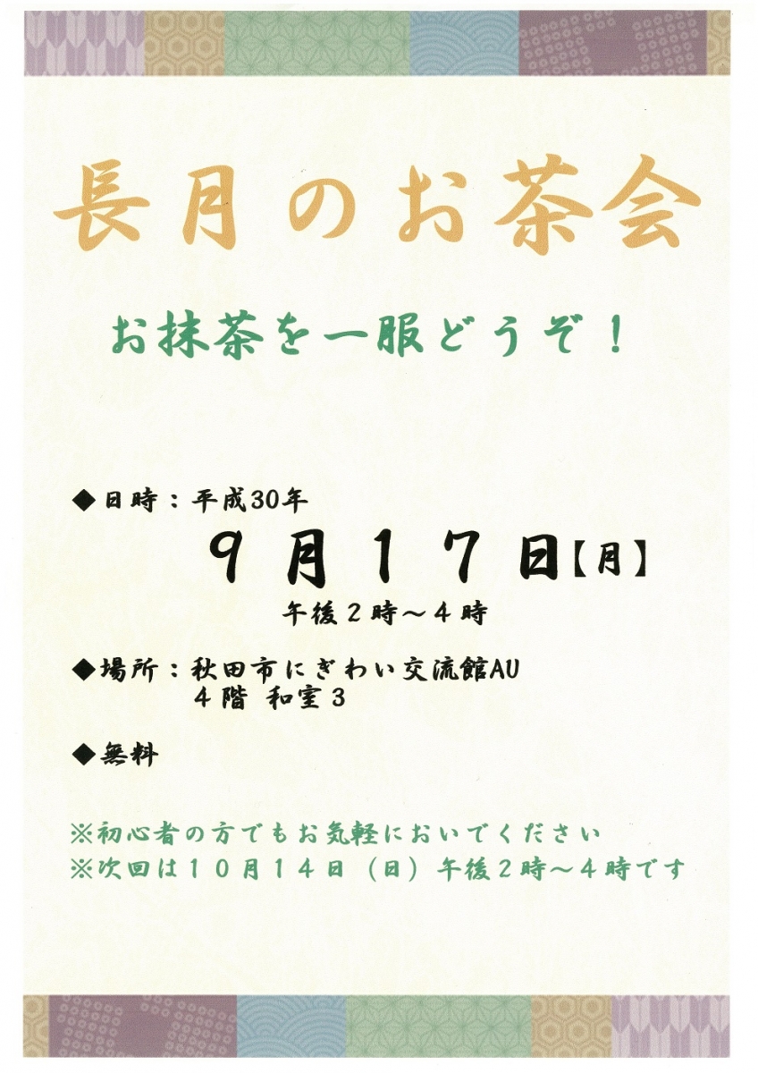長月のお茶会 お抹茶を一服どうぞ! 期間:2018年09月17日 開催日:平成30年9月17日(月) 時 間:14:00~16:00 会 場:にぎわい交流館AU 4F 和室3 参 加:無料 ※初心者の方でもお気軽においでください ※次回は10月14日(日)午後2時~4時です