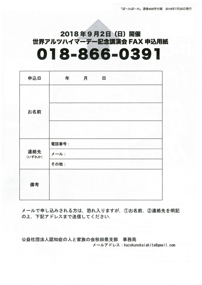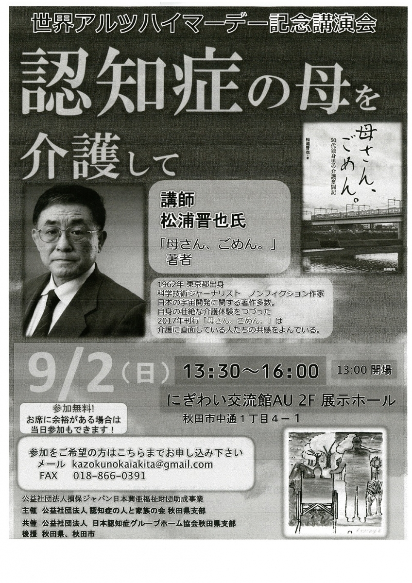 世界アルツハイマーデー記念講演会 「認知症の母を介護して」 期間:2018年09月02日 開催日:平成30年9月2日(日) 時 間:13:30~16:00(開場13:00) 会 場:にぎわい交流館AU 2F 展示ホール 参 加:無料 参加をご希望の方はこちらまでお申し込み下さい メール kazokunokaiakita@gmail.com FAX 018-866-0391(申込用紙) お席に余裕がある場合は当日参加もできます! 主 催:公益社団法人 認知症の人と家族の会 秋田県支部