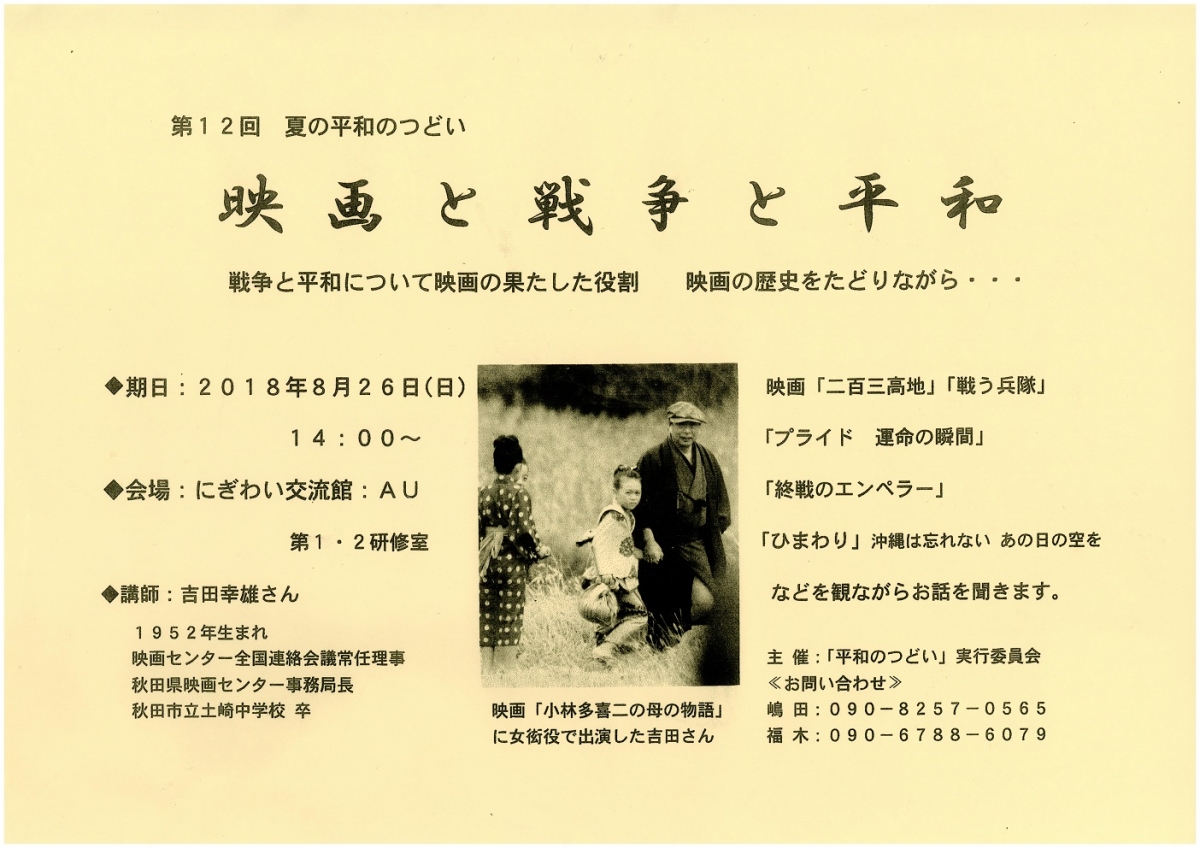 第12回 夏の平和のつどい 「映画と戦争と平和」 期間:2018年08月26日 開催日:平成30年8月26日(日) 時 間:14:00~ 会 場:にぎわい交流館AU 4F 研修室1・2 主 催:「平和のつどい」実行委員会 問合せ:嶋田 090-8257-0565 福木 090-6788-6079
