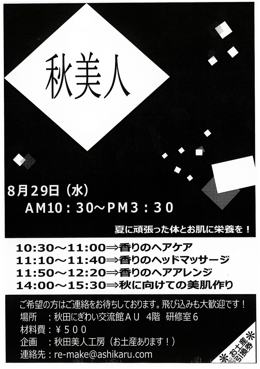 秋美人 夏に頑張った体とお肌に栄養を! 期間:2018年08月29日 開催日:平成30年8月29日(水) 時 間:10:30~15:30 会 場:にぎわい交流館AU 4F 研修室6 材料費:500円 企 画:秋田美人工房(お土産あります!) 連絡先:re-make@ashikaru.com