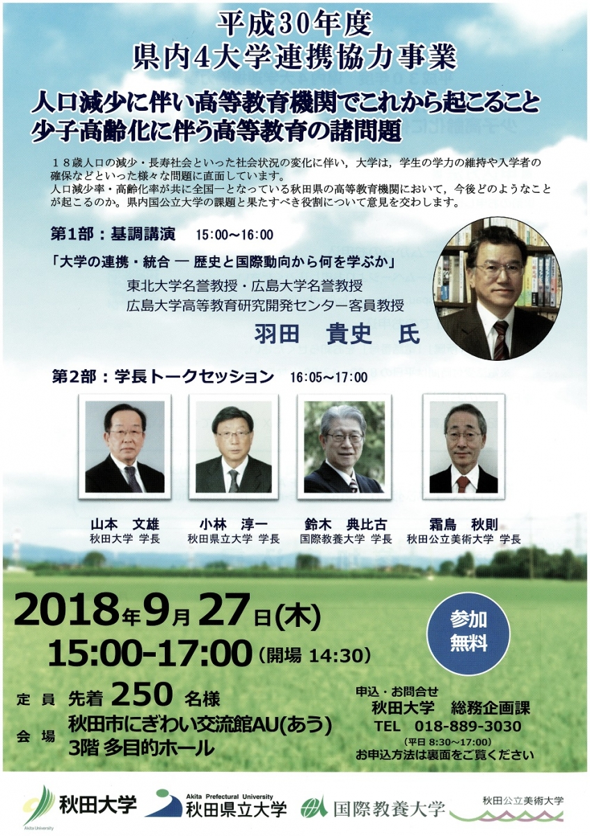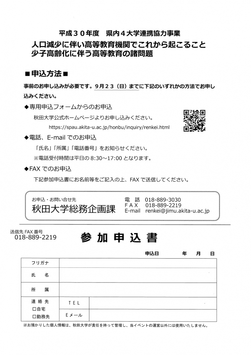 参加申込書にお名前等をご記入の上、FAXで送信してください。 - 申込・問合せ:秋田大学総務企画課