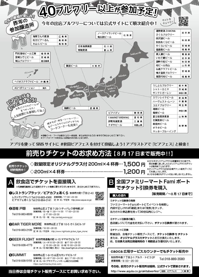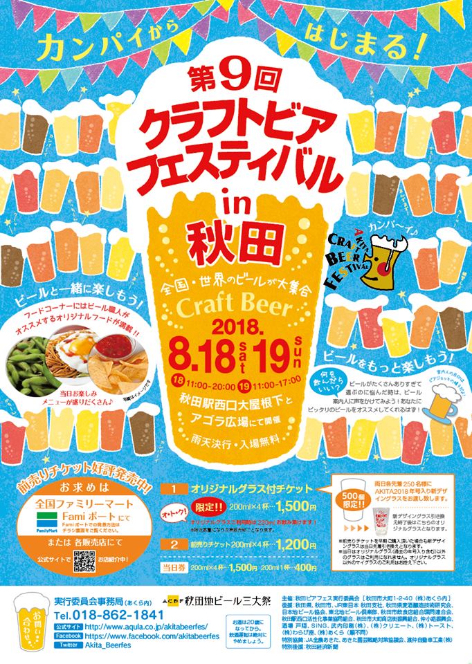 第9回 クラフトビアフェスティバルin秋田 期間:2018年08月18日 ~ 2018年08月19日 カンパイからはじまる! 全国・世界のビールが大集合 開催日時:平成30年8月18日(土) 11時00分~20時00分 19日(日) 11時00分~17時00分 会 場:秋田駅西口大屋根下とアゴラ広場 主 催:秋田ビアフェス実行委員会 問合せ先:実行委員会事務局(あくら内) TEL 018-862-1841 ※ 雨天決行。入場無料。 前売チケット好評発売中!