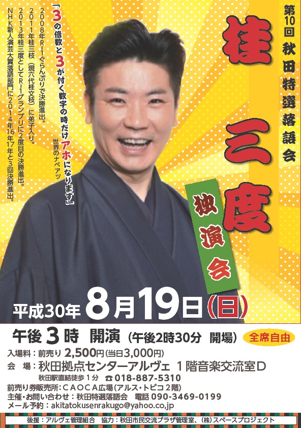 - 問合せ先:秋田特選落語会 TEL 090-3469-0199