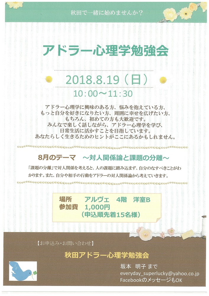 アドラー心理学勉強会 期間:2018年08月19日 開催日:平成30年8月19日(日) 時 間:10時00分~11時30分 会 場:秋田拠点センターアルヴェ 4階洋室B 参加費:1,000円(申込順先着15名様) 問合せ先:秋田アドラー心理学勉強会 坂本 everyday_superlucky@yahoo.co.jp FacebookのメッセージもOK