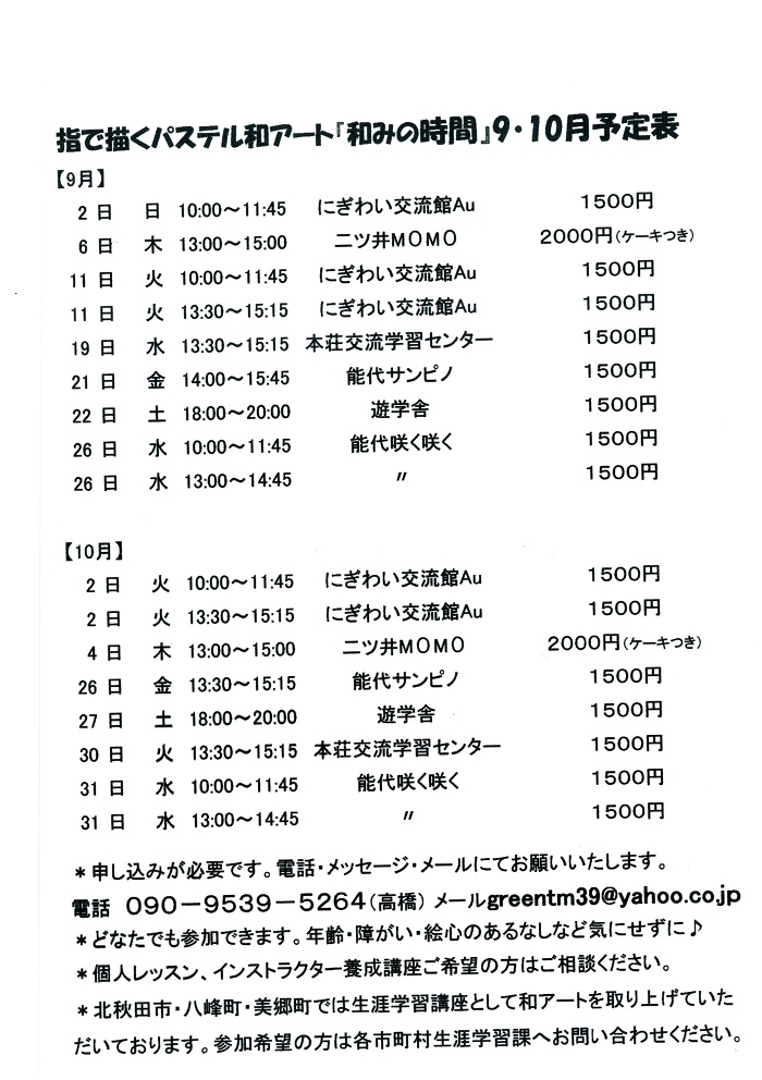 指で描くパステル和アート『和みの時間』平成30年 9・10月予定表