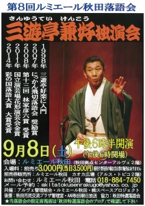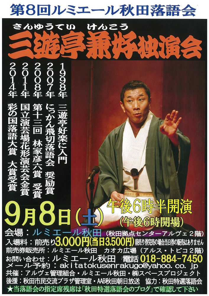 第8回ルミエール秋田落語会 三遊亭兼好独演会 期間:2018年09月08日 開催日:平成30年9月8日(土) 時 間:18時30分開演(18時00分開場) 会 場:秋田拠点センターアルヴェ 2階ルミエール秋田 入場料:前売券 3,000円(当日券 3,500円) 前売券完売の場合、当日券の販売はありません。 前売券販売所:ルミエール秋田、caoca広場(アルス・トピコ2階) 問合せ先:ルミエール秋田 TEL 018-884-7450 ※メール問合せ先は akitatokusenrakugo@yahoo.co.jp