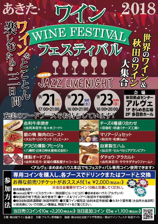秋田ワインフェスティバル in アルヴェ2018 期間:2018年09月21日 ~ 2018年09月23日 世界のワイン、各種フード、そして、ジャズステージをお楽しみください。 開催日:平成30年9月21日(金)~9月23日(日) 時 間: 21日 17時00分~21時00分 22日 16時00分~21時00分 23日 16時00分~20時00分 場 所:秋田拠点センターアルヴェ 1Fきらめき広場、2F多目的ホール 主 催:秋田ワイン協議会 料 金:〈前売チケット〉1枚2,000円 〈当日売りコイン〉10枚2,200円 〈当日追加コイン〉5枚1,100円
