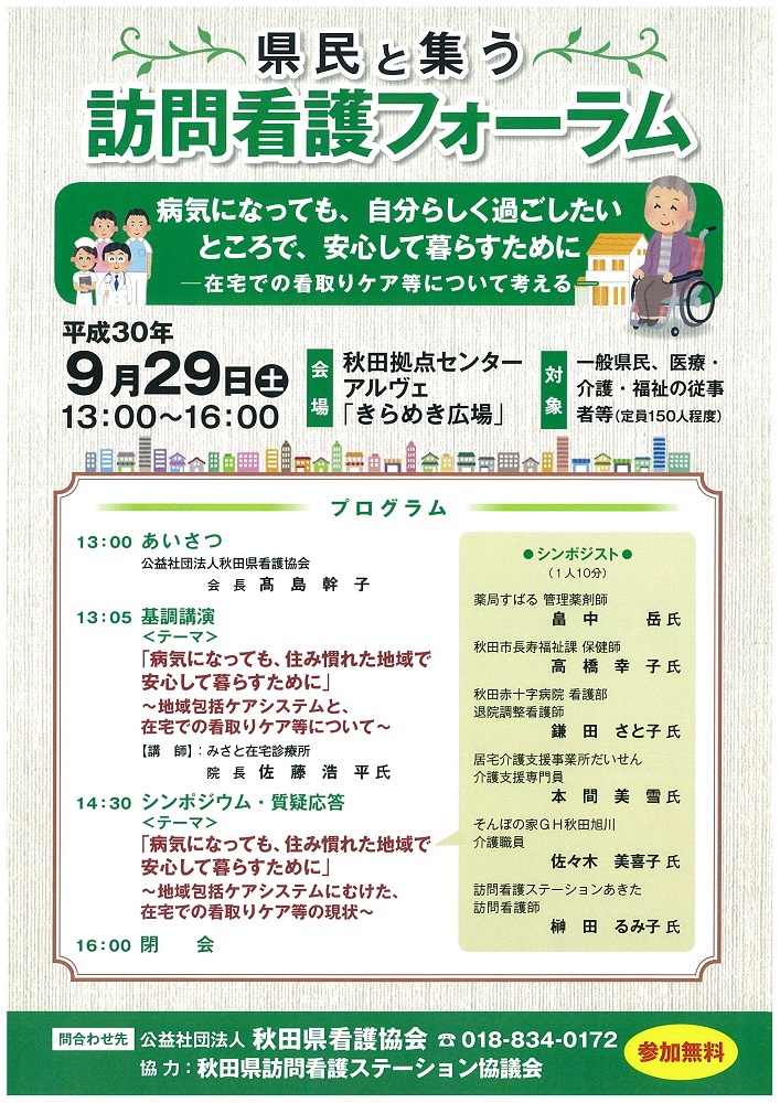 県民と集う訪問看護フォーラム 期間:2018年09月29日 開催日:平成30年9月29日(土) 時 間:13時00分~16時00分 会 場:秋田拠点センターアルヴェ 1階きらめき広場 対 象:一般県民、医療・介護・福祉の従事者等 参加料:参加無料 問合せ先:公益社団法人 秋田県看護協会 TEL 018-834-0172