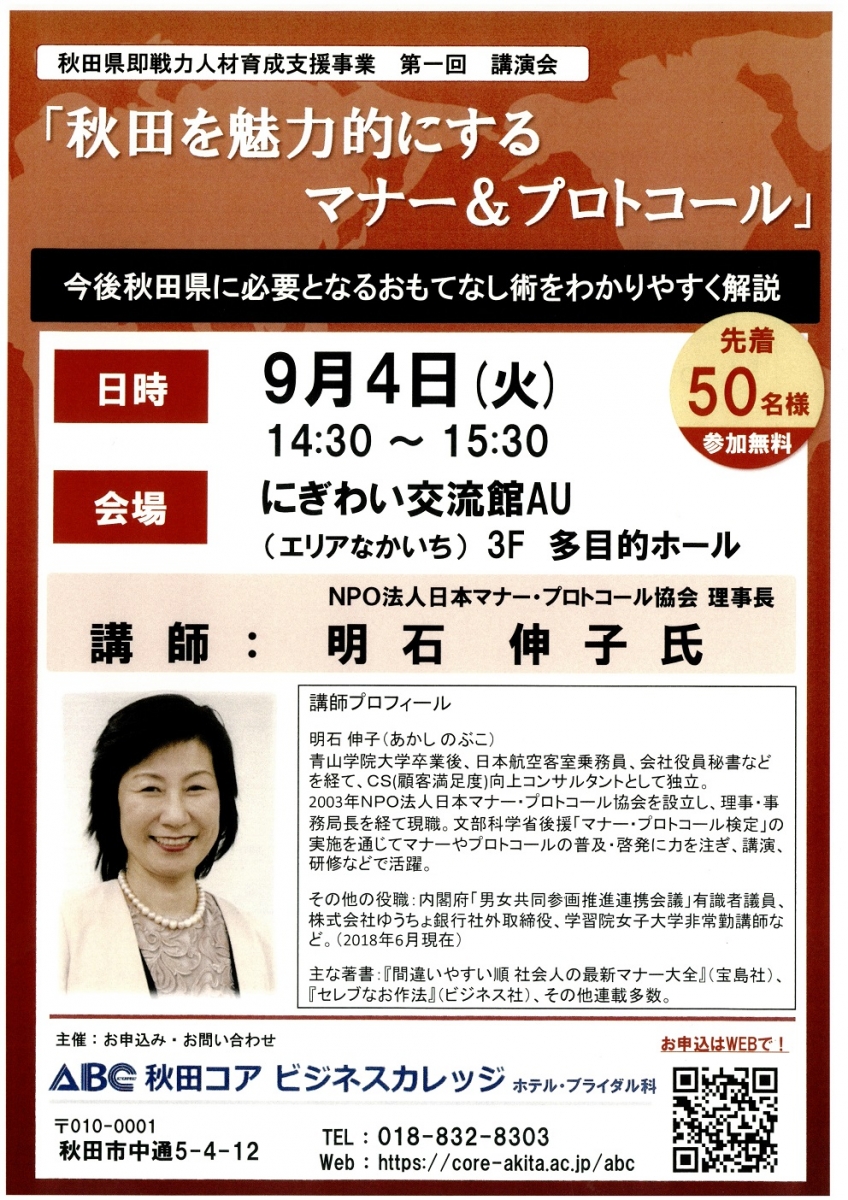 秋田県即戦力人材育成支援事業第一回講演会「秋田を魅力的にするマナー&プロトコール」 期間:2018年09月04日 開催日:平成30年9月4日(火) 時 間:14:30~15:30 会 場:にぎわい交流館AU 3F 多目的ホール 参 加:無料 先着50名様 申込・問合せ:秋田コア ビジネスカレッジ ホテル・ブライダル科 〒010-0001 秋田市中通5-4-12 TEL 018-832-8303 Web https://core-akita.ac.jp/abc/