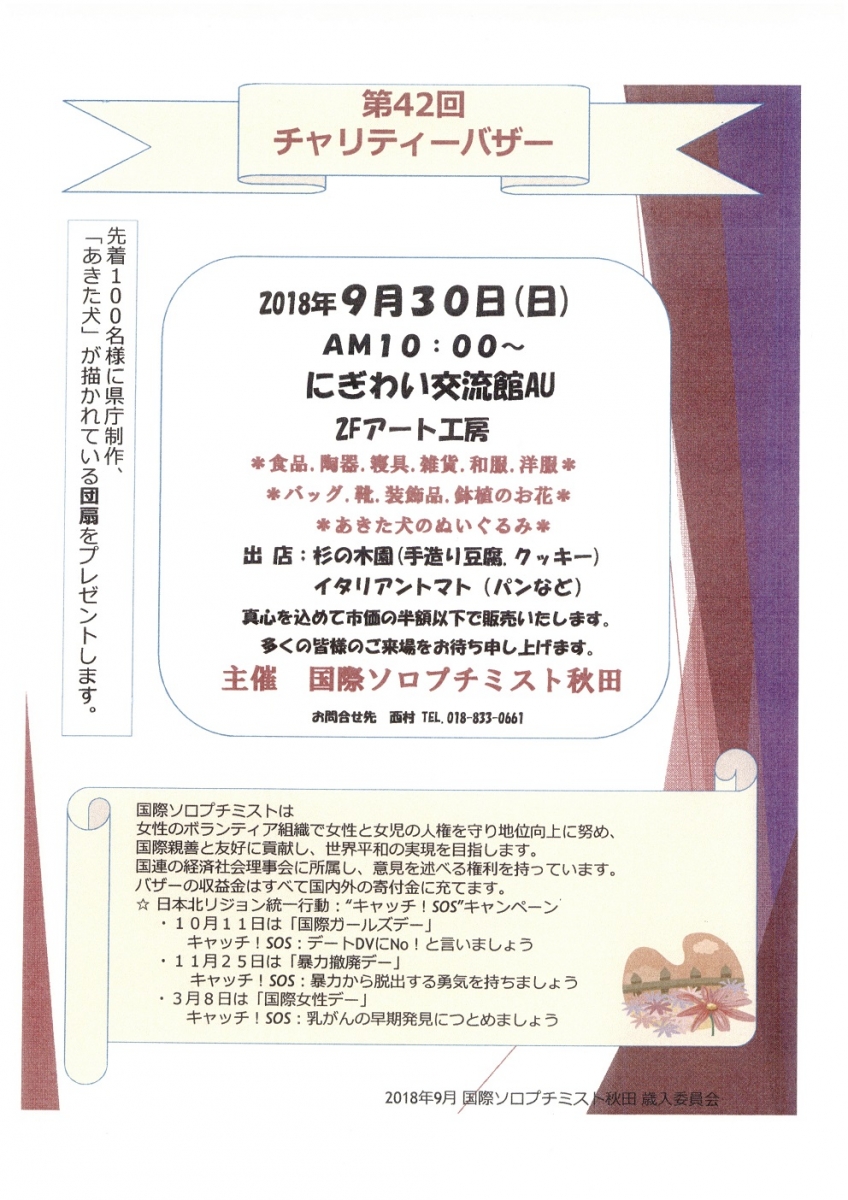 国際ソロプチミスト 第42回チャリティーバザー 期間:2018年09月30日 開催日:平成30年9月30日(日) 時 間:AM10:00~ 会 場:にぎわい交流館AU 2F アート工房1・2食品・陶器・寝具・雑貨・和服・洋服バッグ・靴・装飾品・鉢植のお花あきた犬のぬいぐるみの販売先着100名様に県庁制作、「あきた犬」が描かれている団扇をプレゼントします。 出 展:杉の木園(手造り豆腐・クッキー) イタリアントマト(パンなど)真心を込めて市場の半額以下で販売致します。多くの皆様のご来場をお待ち申し上げます。 主 催:国際ソロプチミスト秋田 問合せ:西村 TEL 018-833-0661