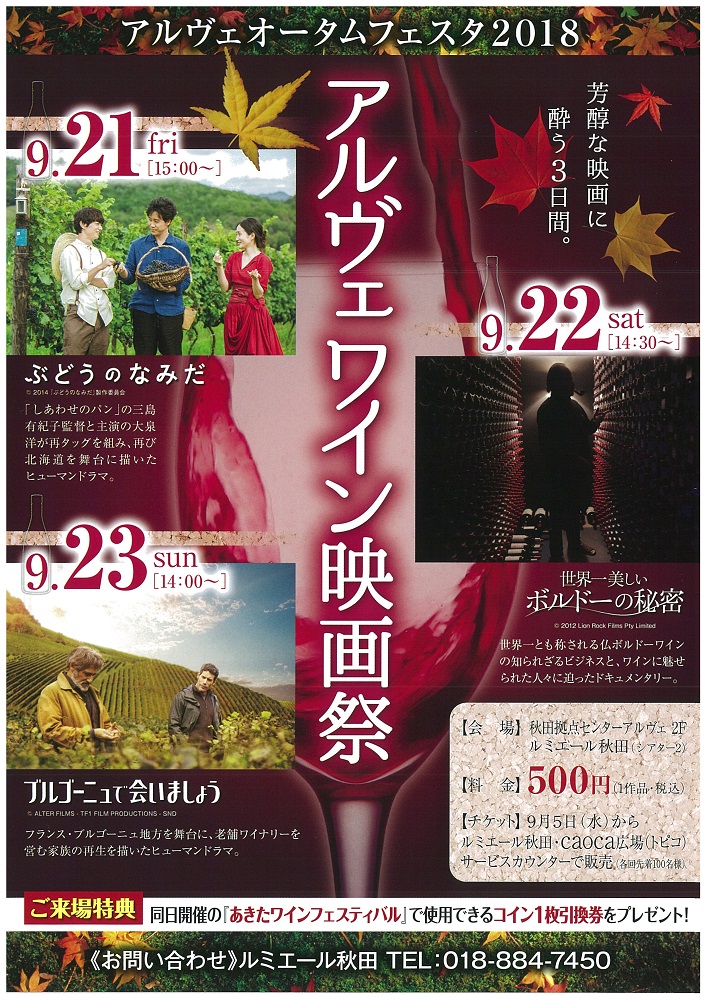 アルヴェワイン映画祭 期間:2018年09月21日 ~ 2018年09月23日 開催日時:平成30年9月21日(金)15時00分から 22日(土)14時30分から 23日(日)14時00分から 会 場:秋田拠点センターアルヴェ 2階ルミエール秋田 料 金:500円(1作品・税込) チケット:9月5日(水)からルミエール秋田、caoca広場(トピコ)で販売 問合せ先:ルミエール秋田 TEL 018-884-7450 ご来場特典:あきたワインフェスティバルで使用できるコイン1枚分の引換券をプレゼント!