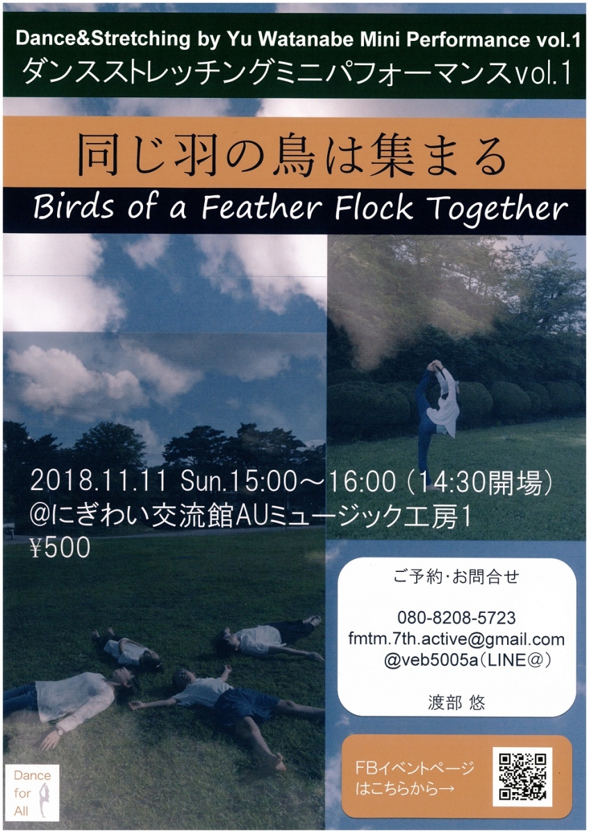 ダンスストレッチングミニパフォーマンスvol.1 「同じ羽の鳥は集まる」 期間:2018年11月11日 開催日:平成30年11月11日(日) 時 間:15:00~16:00 (14:30開場) 会 場:にぎわい交流館AU 3F ミュージック工房1 入場料:500円 予約・問合せ:080-8208-5723 fmtm.7th.active@gmail.com @veb5005a(LINE@) 渡部 悠