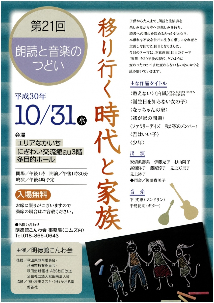 第21回 朗読と音楽のつどい 移り行く時代と家族 期間:2018年10月31日 開催日:平成30年10月31日(水) 時 間:開場13:00 / 開演13:30 / 終演16:00予定 会 場:にぎわい交流館AU 3F 多目的ホール 入 場:無料 問合せ:明徳館こんわ会 事務局<コムズ内> tel 018-866-0643 主 催:明徳館こんわ会
