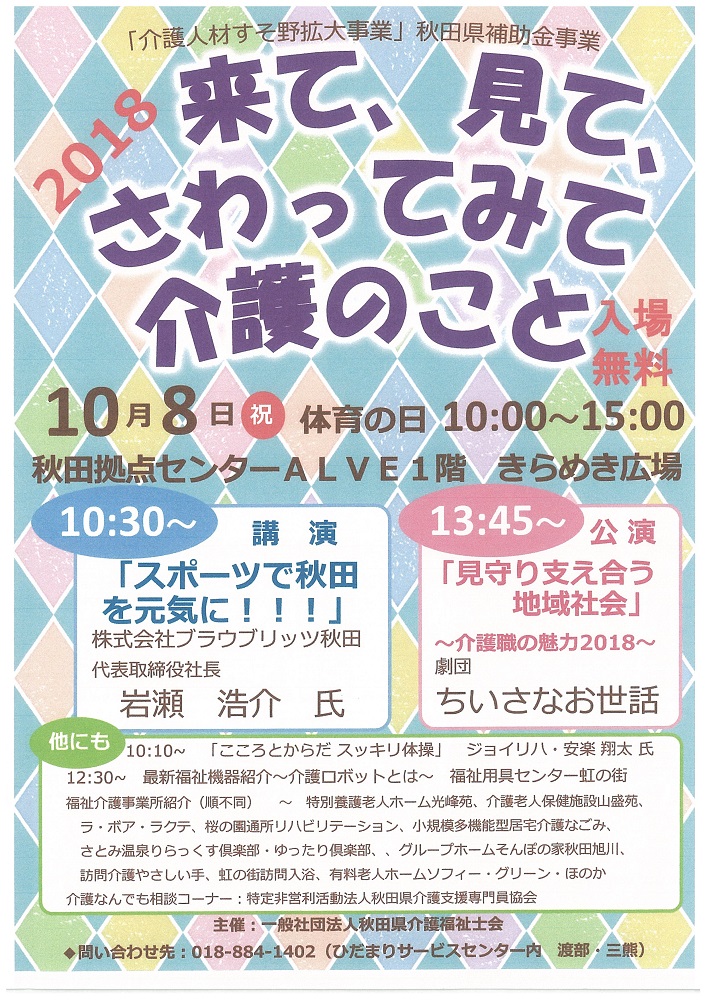 来て、見て、さわってみて介護のこと2018 期間:2018年10月08日 開催日:平成30年10月8日(月祝) 時 間:10時00分~15時00分 会 場:秋田拠点センターアルヴェ1階きらめき広場 入場料:無料 問合せ先:一般社団法人秋田県介護福祉士会 TEL 018-884-1402(ひだまりサービスセンター内 渡辺・三熊)