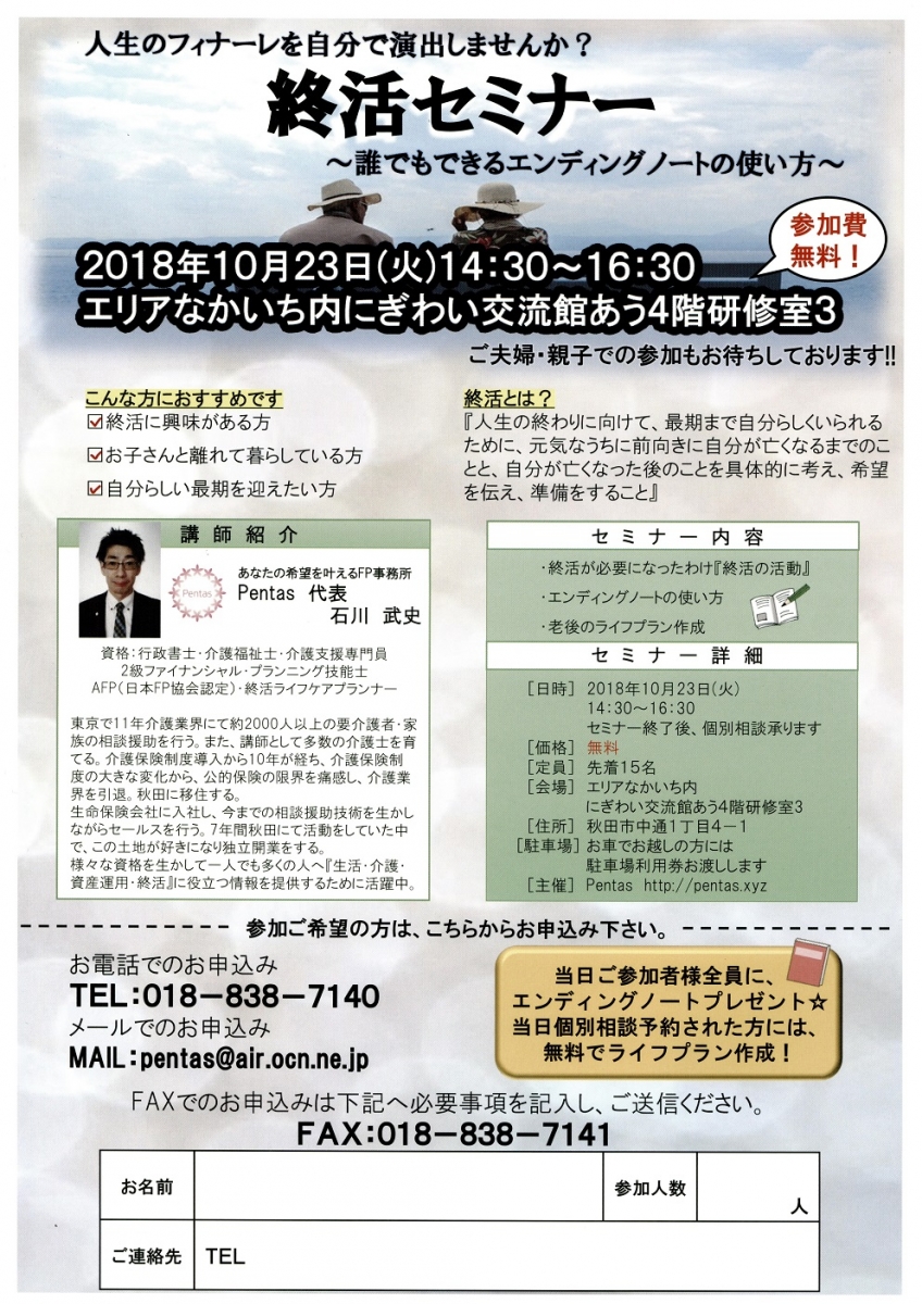 終活セミナー~誰でもできるエンディングノートの使い方~ 期間:2018年10月23日 開催日:平成30年10月23日(火) 時 間:14:30~16:30 会 場:にぎわい交流館AU 4F 研修室3 参 加:無料 定 員:先着15名 申 込:TEL 018-838-7140 mail pentas@air.ocn.ne.jp FAX 018-838-7141 申込書 FAXでお申込みは必要事項を記入し、ご送信ください。 主 催:Pentas