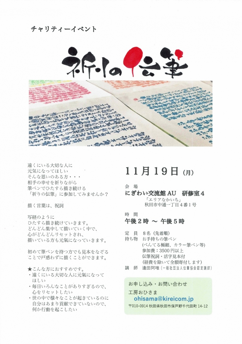 チャリティーイベント 祈りの伝筆 期間:2018年11月19日 開催日:平成30年11月19日(月) 時 間:14:00~17:00 会 場:にぎわい交流館AU 4F 研修室4 定 員:8名(先着順) 持ち物:お手持ちの筆ペン(ぺんてる極細、カラー筆ペン等) 参加費:3,500円以上 伝筆祝詞・活字見本付 (経費を除いて全額寄付します) 申込・問合せ:工房おひさま ohisama@kireicom.jp 〒010-0914 秋田市保戸野千代田町14-12