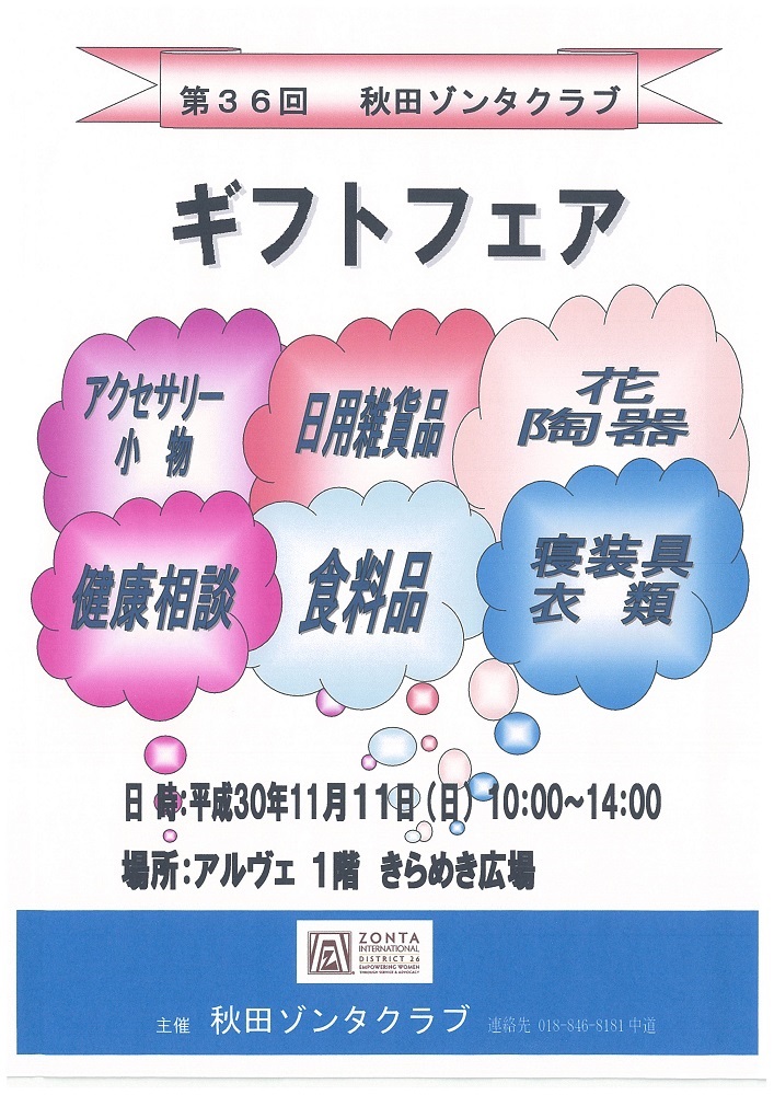 第36回秋田ゾンタクラブ ギフトフェア 期間:2018年11月11日 開催日:平成30年11月11日(日) 時 間:10時00分~14時00分 会 場:秋田拠点センターアルヴェ1階 きらめき広場 問い合わせ先:秋田ゾンタクラブ 中道 018-846-8181