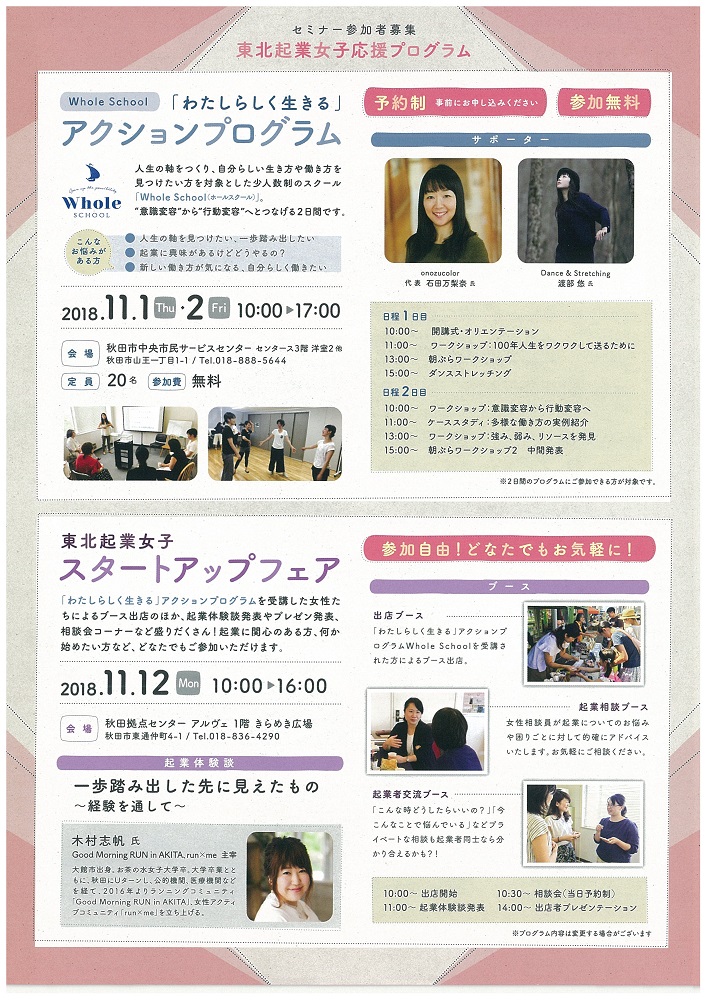 東北起業女子 スタートアップフェア 期間:2018年11月12日 開催日:平成30年11月12日(月) 時 間:10時00分~16時00分 会 場:秋田拠点センターアルヴェ1階 きらめき広場 問い合わせ先:女性起業家等支援ネットワーク構築事業 東北ブロック事務局 電話 0242-23-8268 メール josei-nw@naxia.jp ★ 参加自由。どなたでもお気軽に!