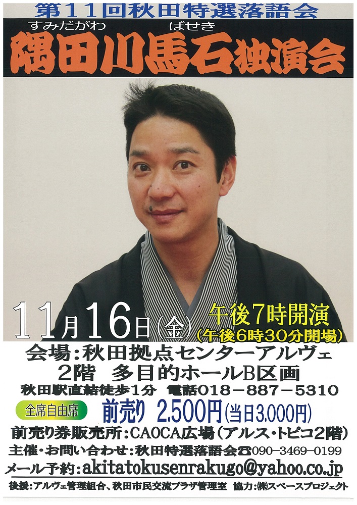 第11回秋田特選落語会 隅田川馬石独演会 期間:2018年11月16日 開催日:平成30年11月16日(金) 時 間:19時00分開演(18時30分開場) 会 場:秋田拠点センターアルヴェ 2階多目的ホールB区画 料 金:前売り2,500円(当日3,000円) 全席自由 前売券販売所:caoca広場(アルス・トピコ2階) 問い合わせ先:秋田特選落語会 090-3469-0199