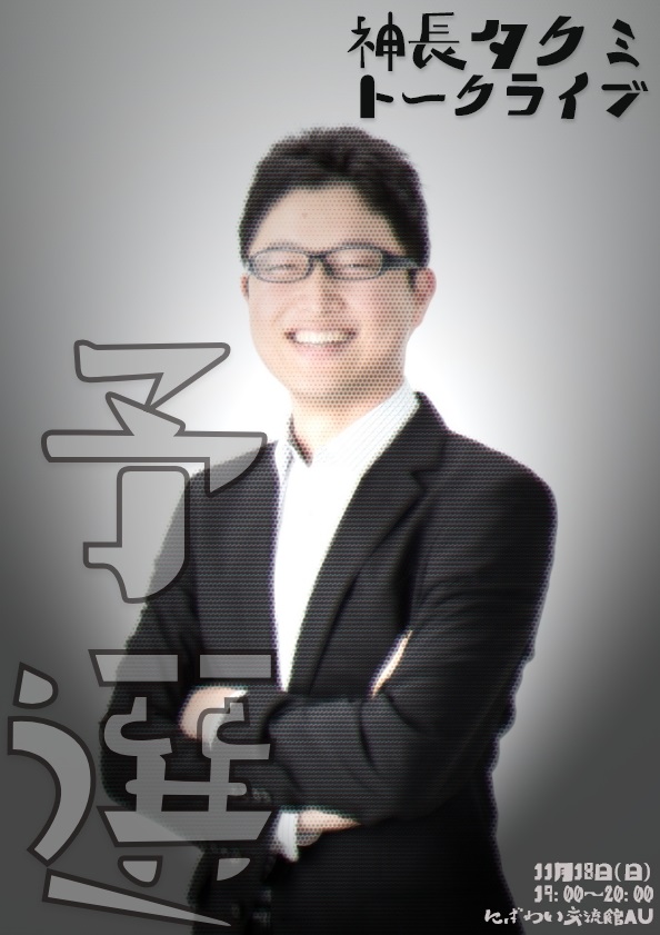 神長タクミトークライブ 予選 期間:2018年11月18日 開催日:平成30年11月18日(日) 時 間:19:00~20:00 会 場:にぎわい交流館AU 4F 和室1・2 入場料:800円 問合せ:https://studio-vk.info/talk-live-yosen/