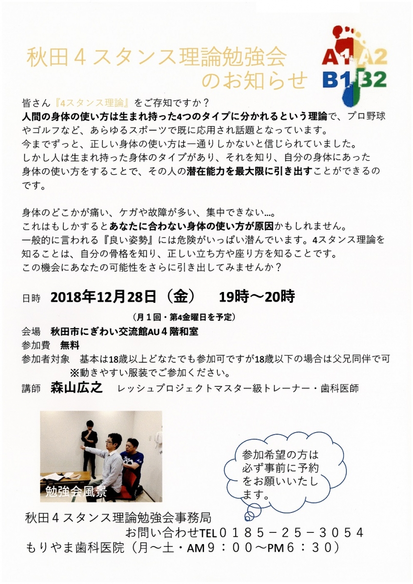 秋田4スタンス理論勉強会のお知らせ 期間:2018年12月28日 開催日:平成30年12月28日(金) 時 間:19:00~20:00 会 場:にぎわい交流館AU 4F 和室1 参 加:無料 ※参加希望の方は必ず事前に予約をお願いいたします 参加者対象:基本は18歳以上どなたでも参加可ですが 18歳以下の場合は父兄同伴で可 ※動きやすい服装でご参加ください。 問合せ:秋田4スタンス理論勉強会事務局 TEL 0185-25-3054 もりやま歯科医院 (月~土 AM9:00~PM6:30)