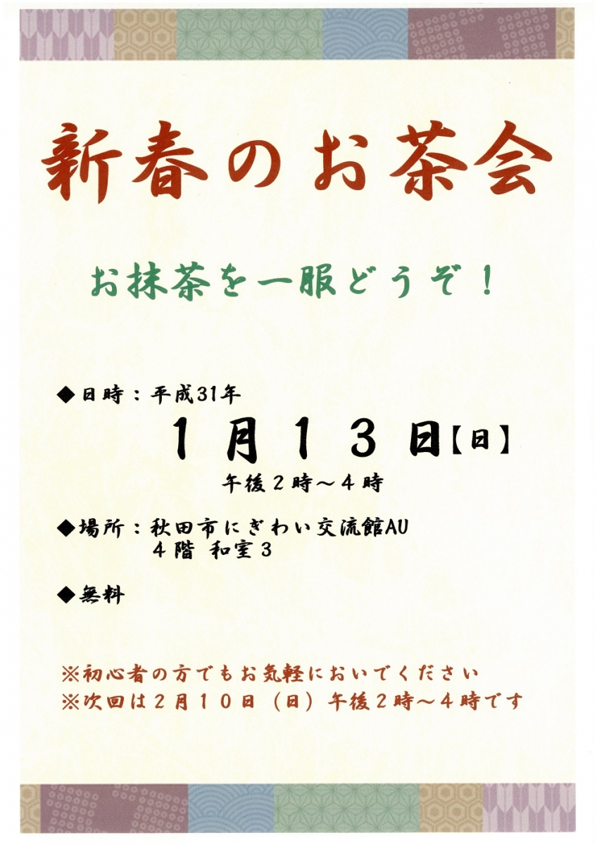 新春のお茶会 お抹茶を一服どうぞ 期間:2019年01月13日 開催日:2019年1月13日(日) 時 間:14:00~16:00 会 場:にぎわい交流館AU 4F 和室3 参 加:無料 ※初心者の方でもお気軽においでください ※次回は2月10日(日)午後2時~4時です