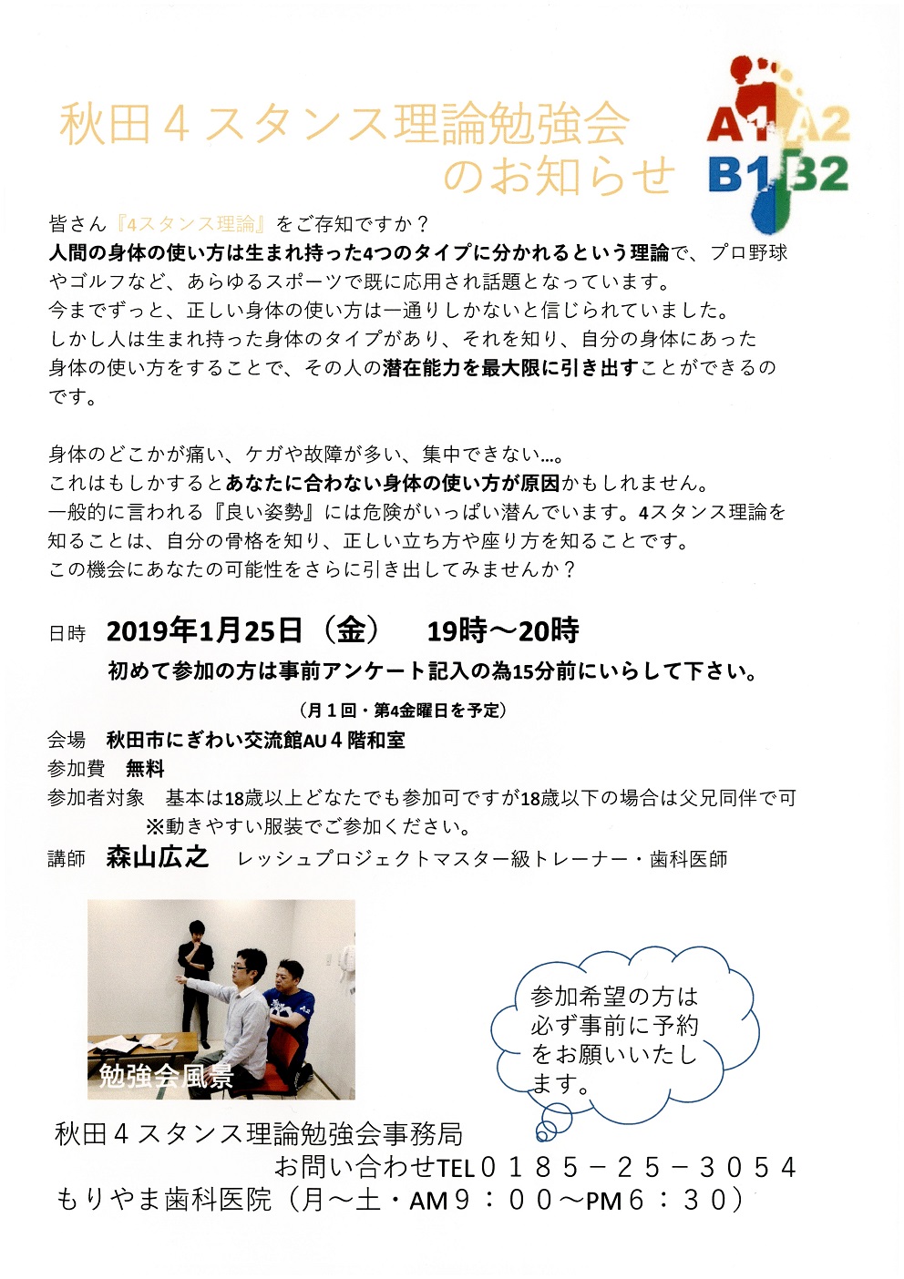 秋田4スタンス理論勉強会のお知らせ 期間:2019年01月25日 開催日:2019年1月25日(金) 時 間:19:00~20:00 初めて参加の方は事前アンケート記入の為15分前にいらして下さい。 会 場:にぎわい交流館AU 4F 和室1 参 加:無料 参加希望の方は必ず事前に予約をお願いいたします。 参加対象:基本は18歳以上どなたでも参加可ですが18歳以下の場合は父兄同伴で可 ※動きやすい服装でご参加ください。 問合せ:秋田4スタンス理論勉強会事務局 TEL 0185-25-3054 もりやま歯科医院(月~金・AM9:00~PM6:30)