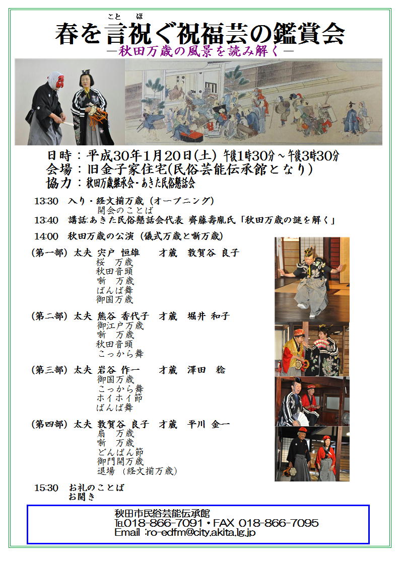 春を言祝ぐ祝福芸の鑑賞会-秋田万歳の風景を読み解く- 期間:2019年01月20日 開催日:2019年01月20日 (土) 時 間:13時30分~15時30分 会 場:旧金子家住宅(秋田県秋田市大町一丁目3-31) 問合せ先:秋田市民俗芸能伝承館 TEL 018-866-7091
