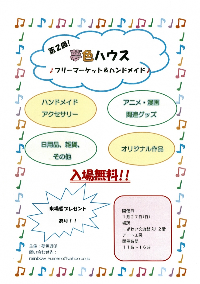 第2回! 夢色ハウス フリーマーケット&ハンドメイド 期間:2019年01月27日 開催日:2019年1月27日(日) 時 間:11:00~16:00 会 場:にぎわい交流館AU 2F アート工房1・2 主 催:夢色透明 問合せ:rainbow_yumeiro@yahoo.co.jp