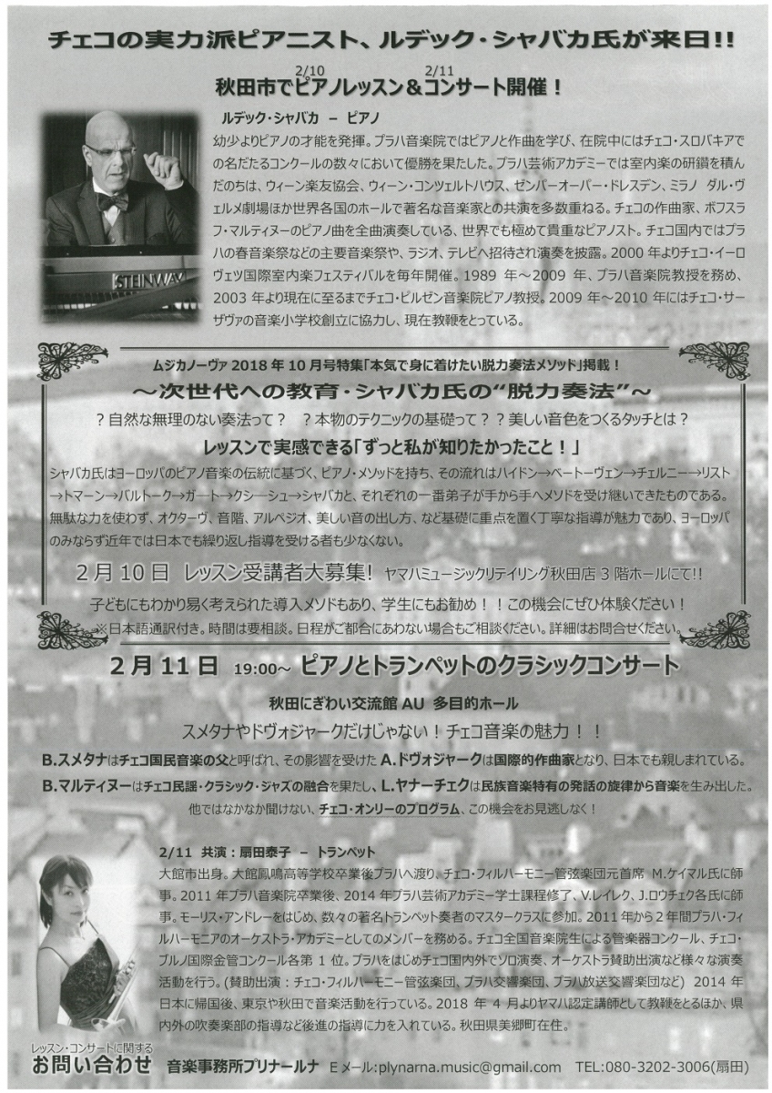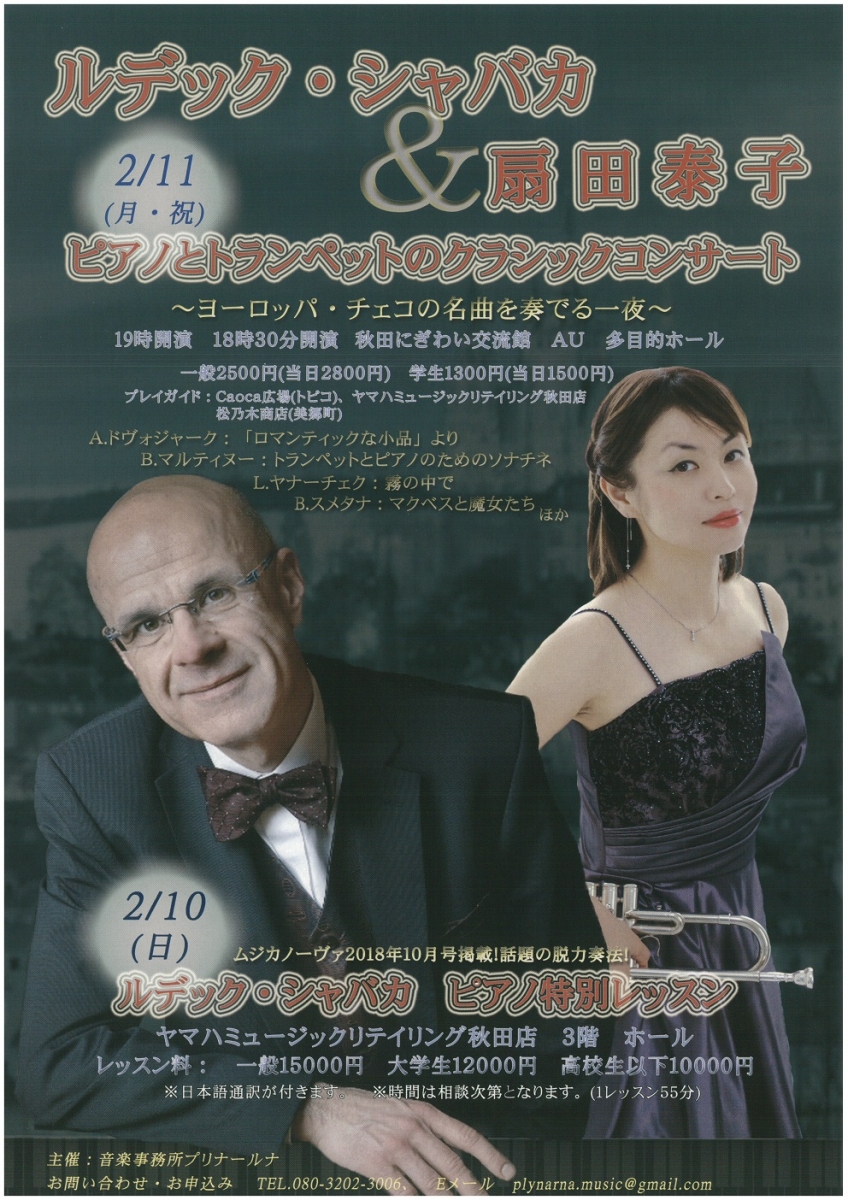 ルディック・シャバカ&扇田泰子 ピアノとトランペットのクラシックコンサート 期間:2019年02月11日 開催日:2019年2月11日(月・祝) 会 場:にぎわい交流館AU 3F 多目的ホール チケット:一般 2,500円(当日2,800円) 学生1,300円(当日1,500円) [プレイガイド] Caoca広場(トピコ)、ヤマハミュージックリテイリング秋田店、松乃木商店(美郷町) 主 催:音楽事務所プリナールナ 問合せ・申込:TEL 080-3202-3006 E-mail plynarna.music@gmail.com