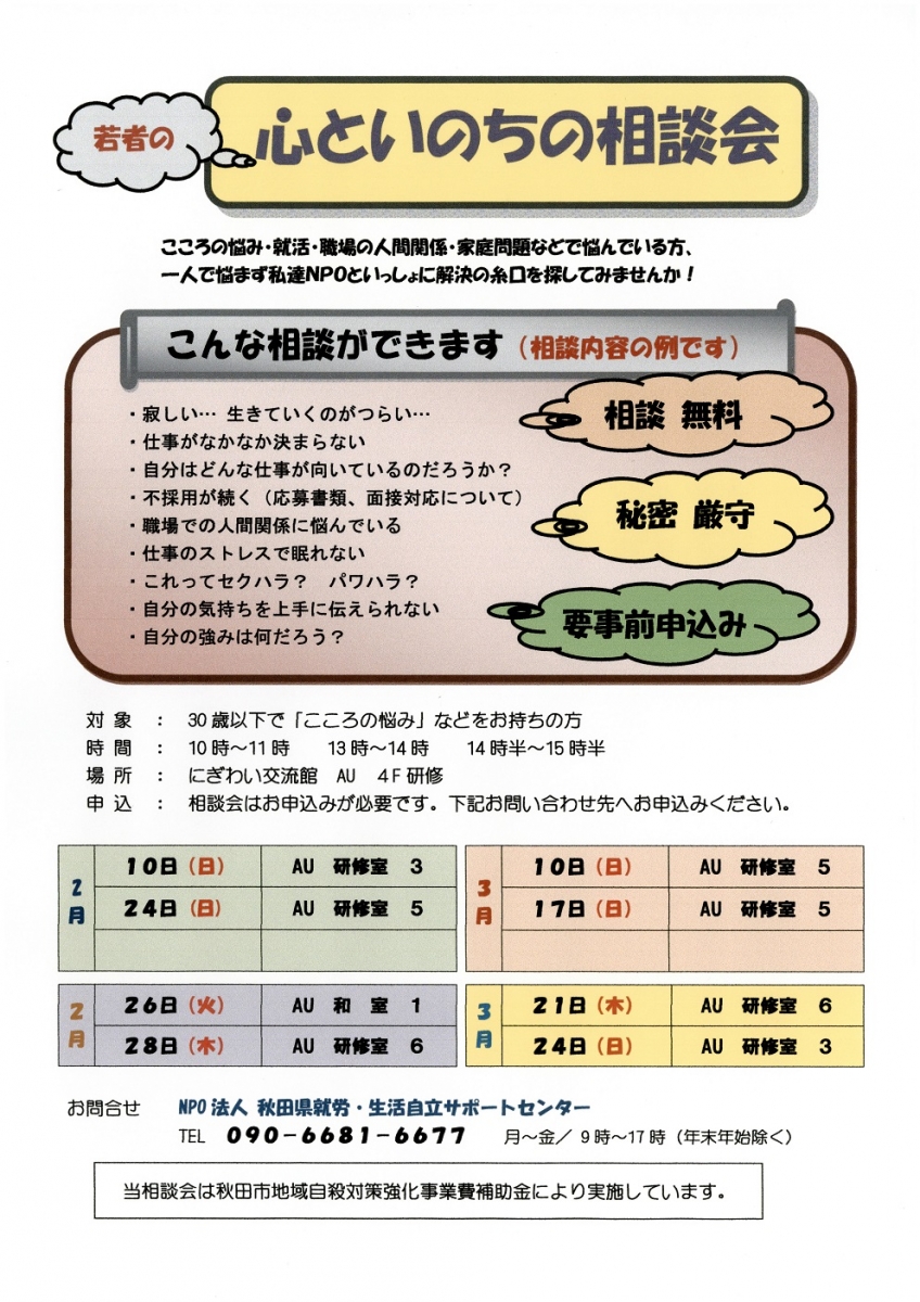 下記お問い合わせ先へお申込みください。 - 問合せ:NPO法人 秋田県就労・生活自立サポートセンター