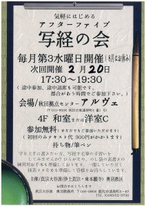 気軽にはじめるアフターファイブ 写経の会 期間:2019年02月20日 開催日:2019年2月20日(水) 時 間:17時30分~19時30分 会 場:秋田拠点センターアルヴェ 4階洋室C 料 金:参加無料(初回のみテキスト代300円がかかります) 主 催:真宗大谷派(浄土真宗・東本願寺)奥羽教区 問合せ先: 真宗大谷派 奥羽教務所 TEL 0185-52-3730 ★どなたでもご参加ただけます。